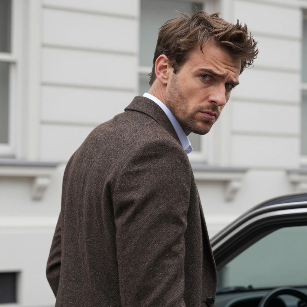 Male with wet, dark brown hair wearing a shiny black leather jacket. Background has red lighting and a partially visible door frame. He stands with a serious expression, looking to the left. Water droplets on his jacket. Medium close-up.