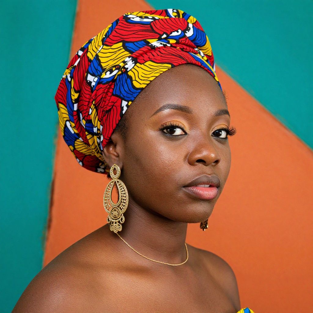Vibrant portrait captures a Black woman adorned in a colorful headwrap featuring red, yellow, and blue patterns, complemented by intricate gold earrings and a delicate necklace, set against a bold background of teal and orange hues.