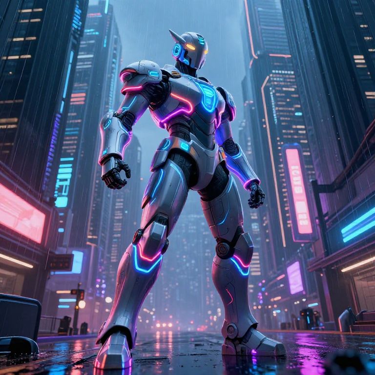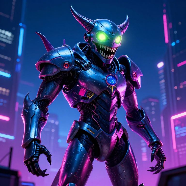 Three eyed monster with bright neon colors, standing in a futuristic cityscape at night, cyberpunk style, sharp teeth, metallic armor, glowing eyes illuminating the surroundings.