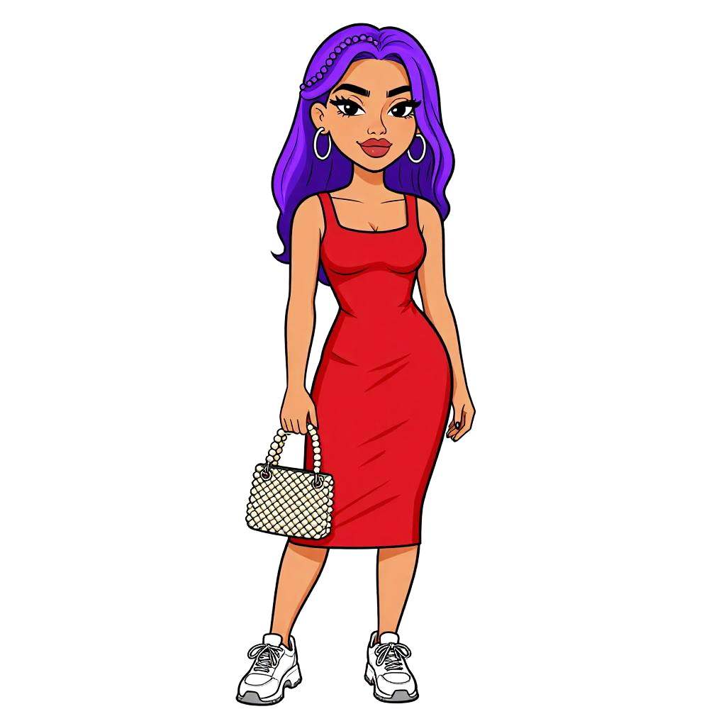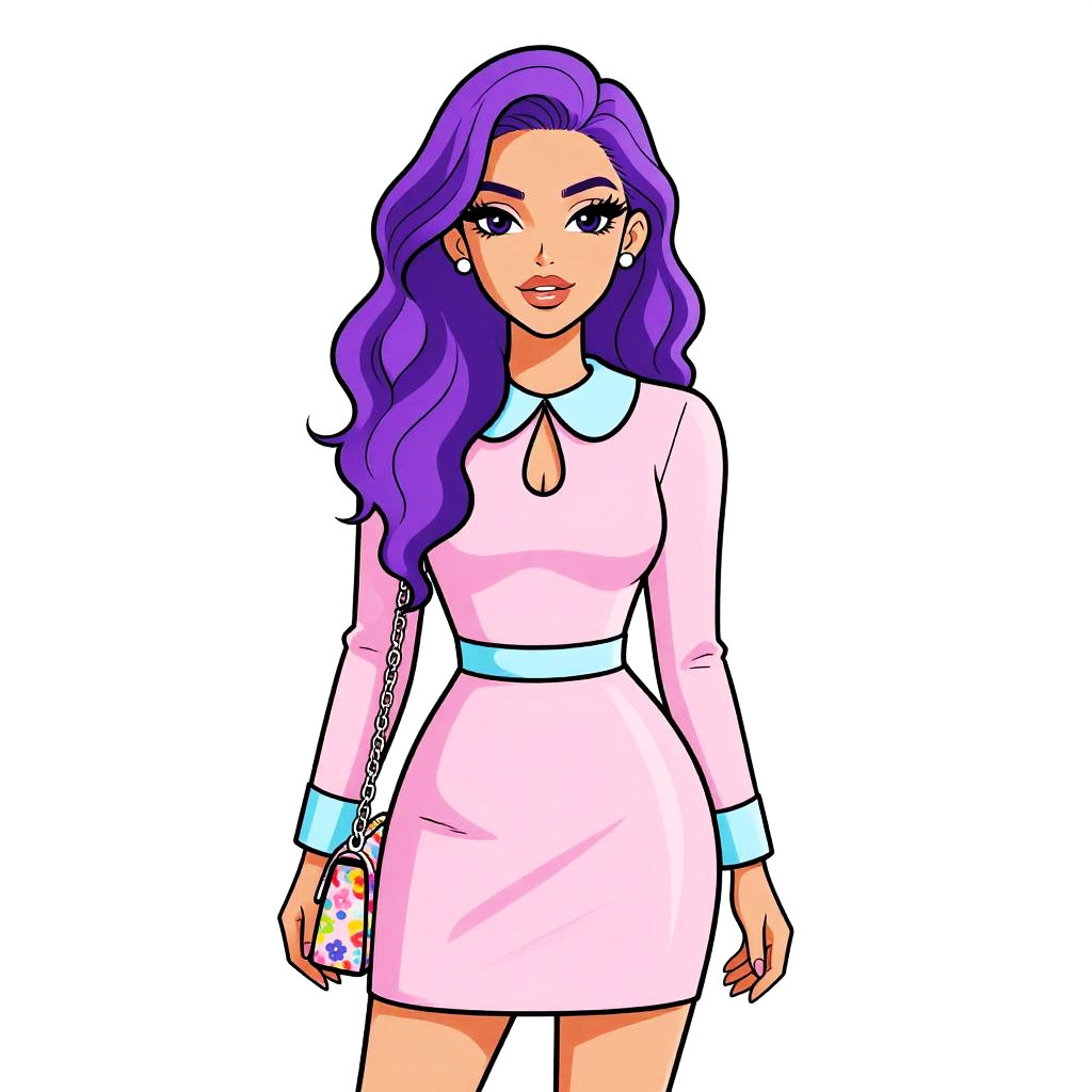 Woman with pretty face and pretty hair. Woman, body-conscious, ribbed knit dress in sky blue, round neckline, long sleeves, knee-length, fitted silhouette, cream ruched handbag, transparent high-heeled shoes, white backdrop. --sref 1467
