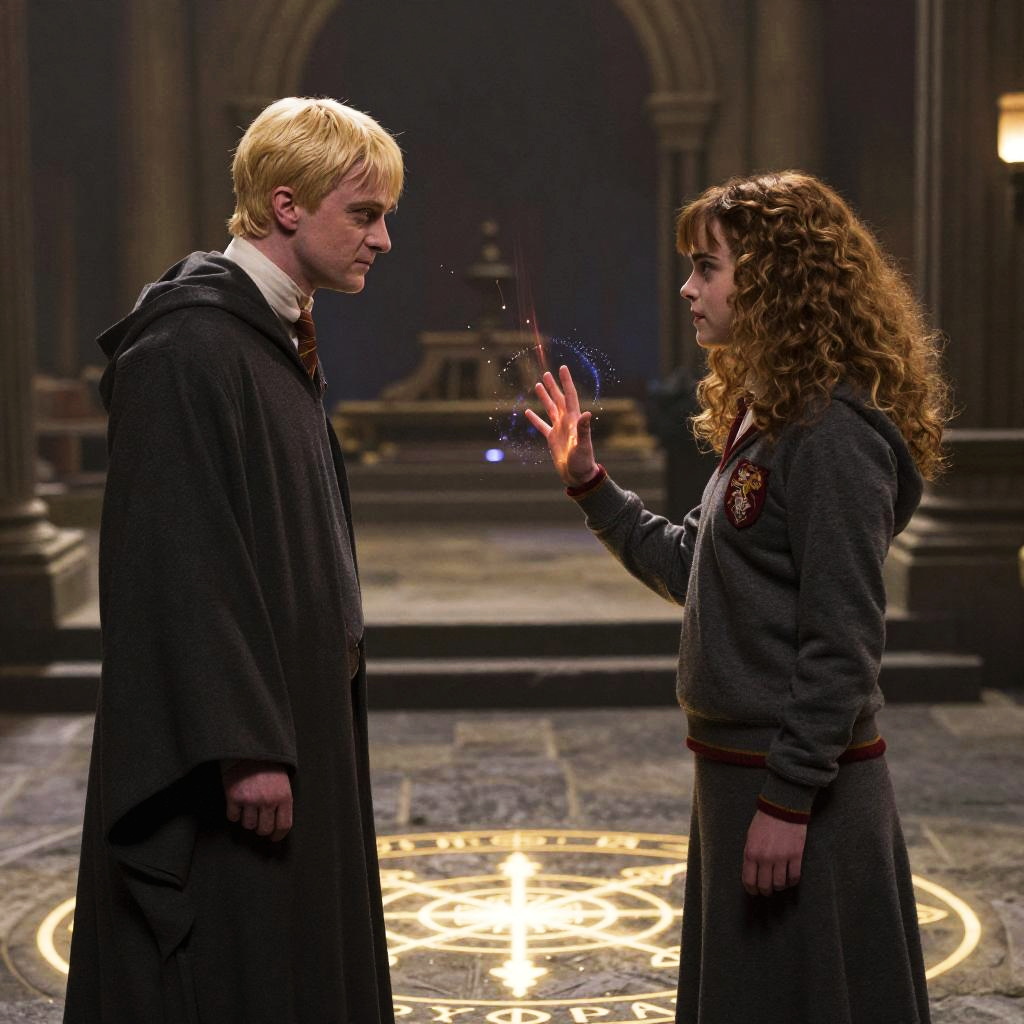 Draco Malfoy and Hermione Granger in Hogwarts courtyard at dusk, wearing their school robes, exchanging a secretive glance, with falling autumn leaves around them and the castle’s silhouette in the background, realistic digital painting with warm tones.