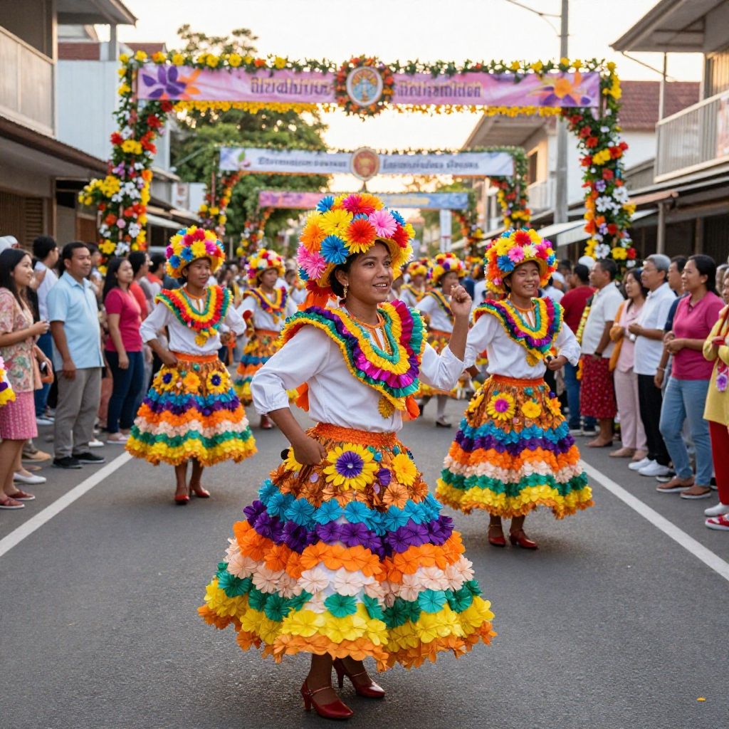 Panagbenga festival costume modeled in a dynamic street procession, with dancers wearing large flower hats and layered skirts of colorful petals, crowd-lined streets decorated with floral arches and banners under warm daylight creating a cheerful mood