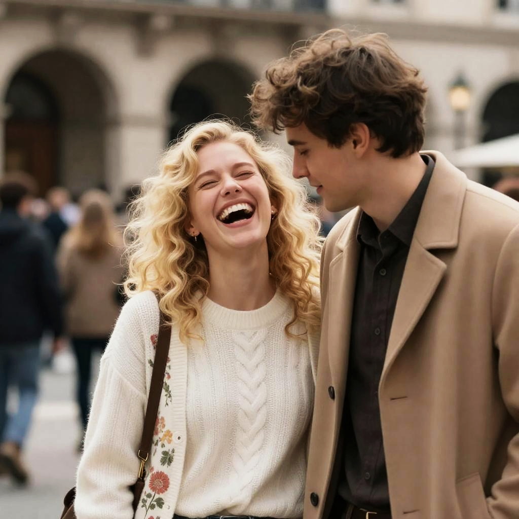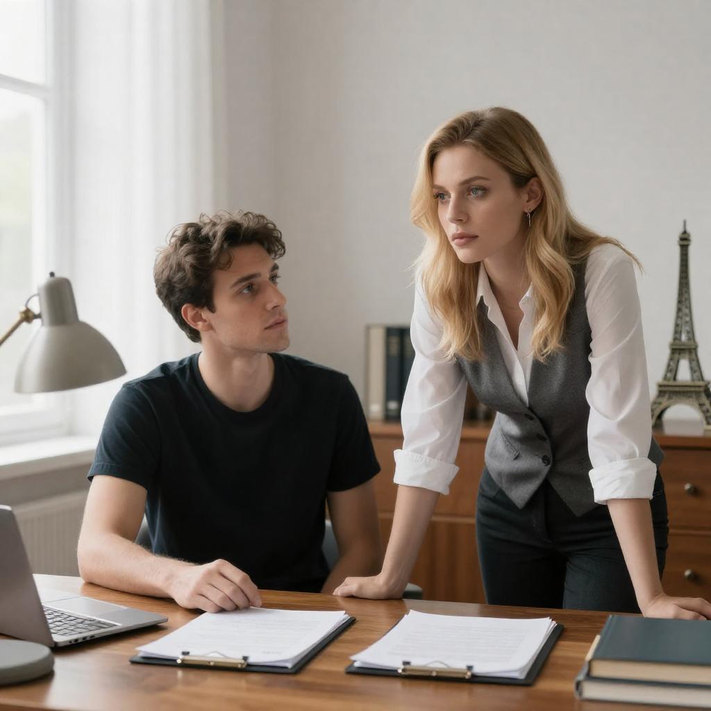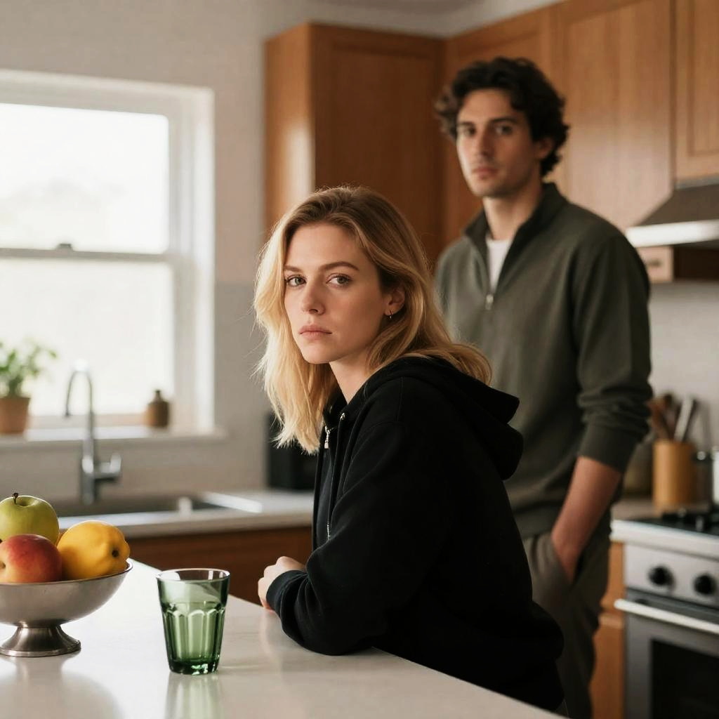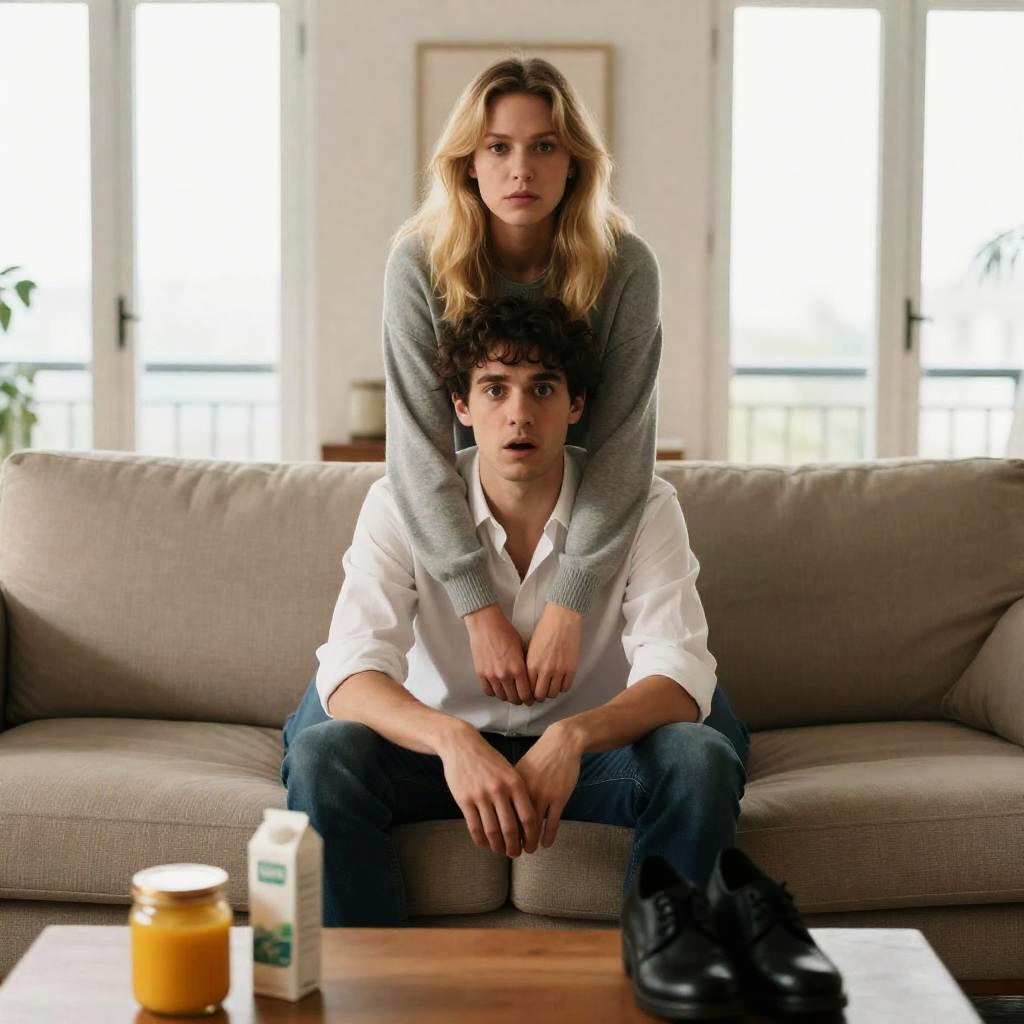 A photograph of a man and woman on a beige couch. The woman with blonde hair and gray sweater straddles the man with dark hair and white shirt. She looks serious, he looks surprised. Background includes large windows with white frames and a balcony. Foreground has a coffee table with a yellow jar, milk carton, and black shoes.