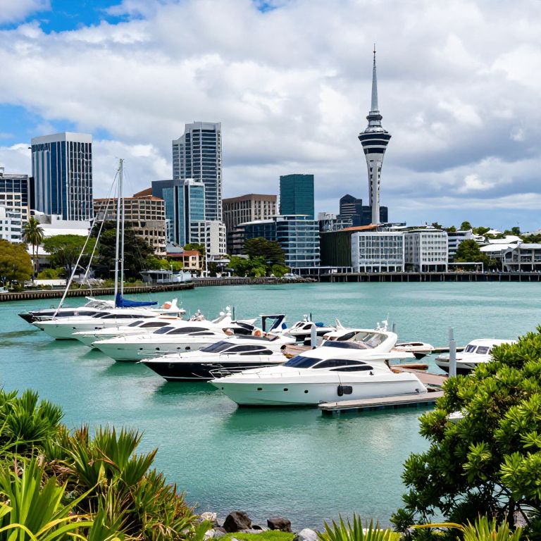 Vibrant marina scene in Auckland, showcasing rows of sleek yachts docked along calm turquoise waters, framed by lush greenery and a backdrop of modern city architecture under a partly cloudy sky.