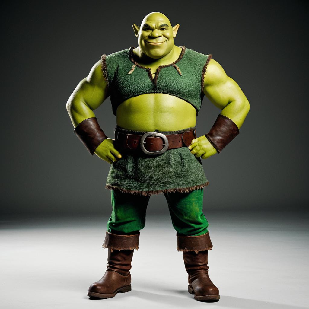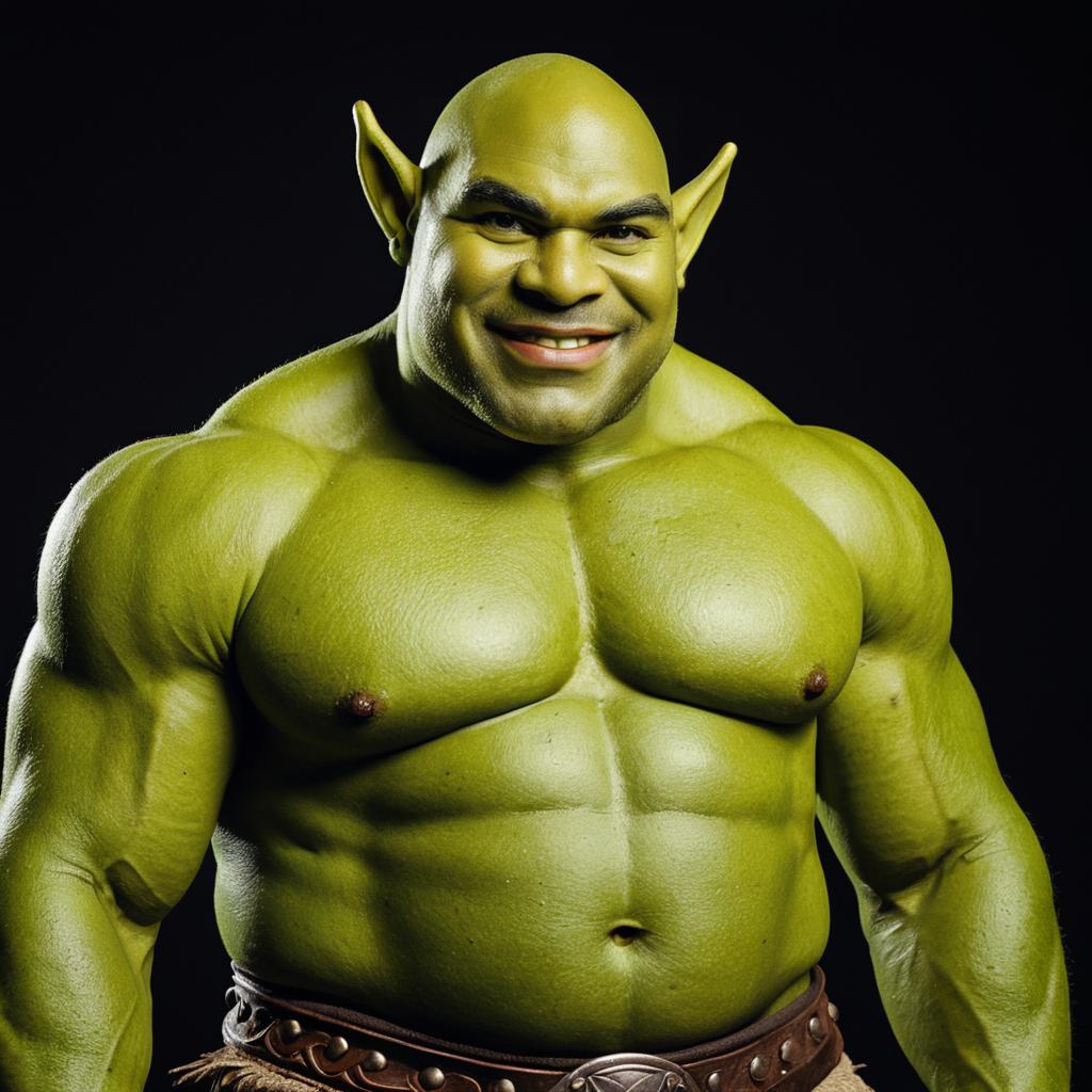 Shrek inspired,male focus, 1boy, green skin, solo, colored skin, orc, navel, loincloth, bald, looking at viewer, pointy ears, facial hair, smile, muscular, fat, mustache, cowboy shot, belly