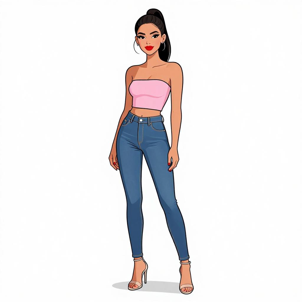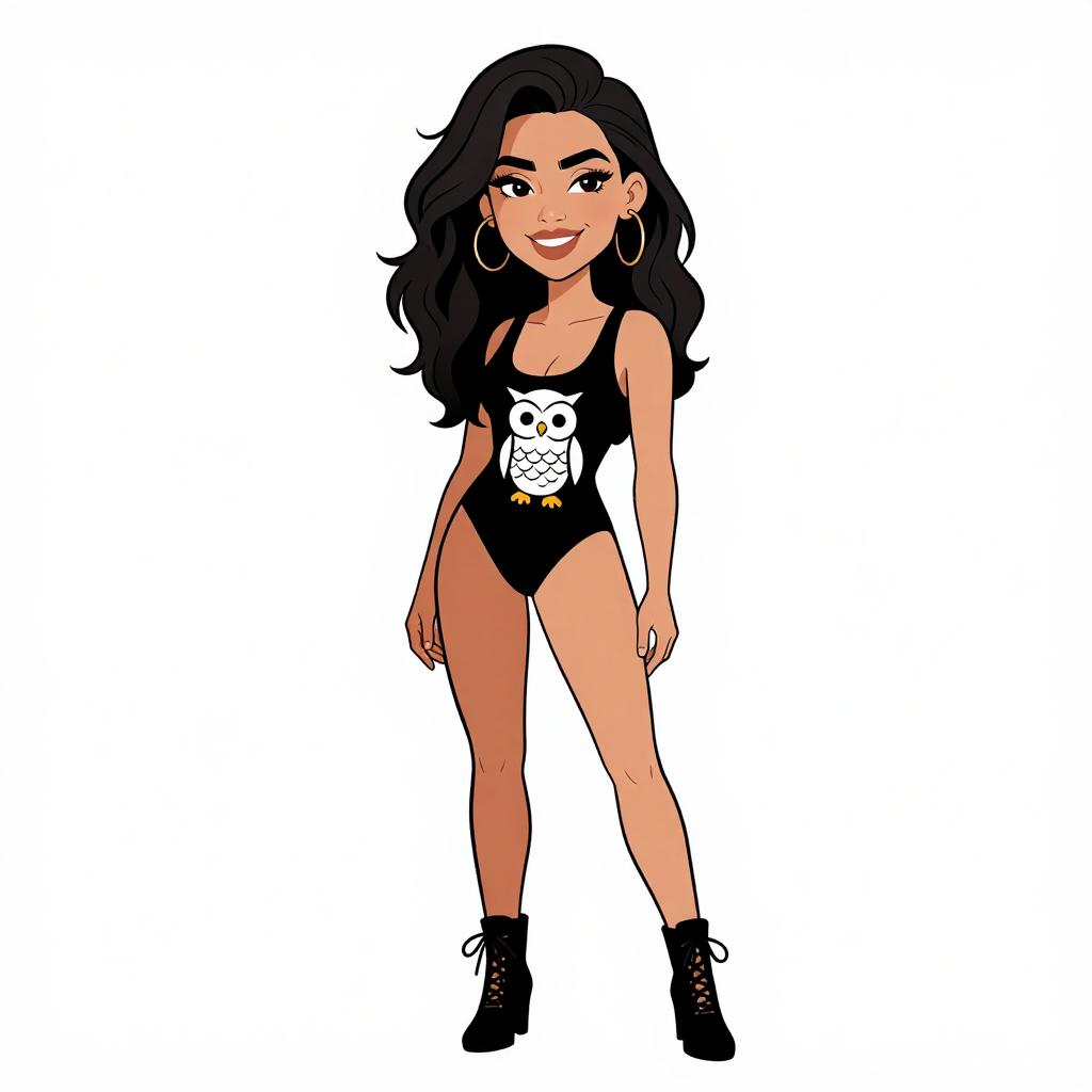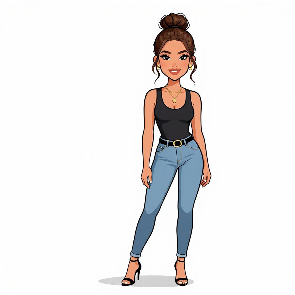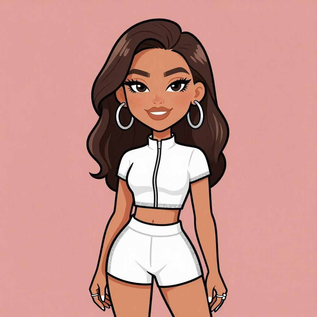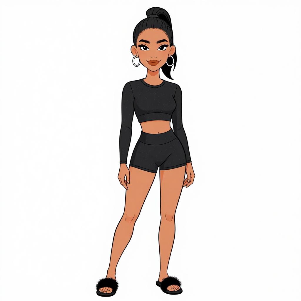 Woman with pretty face and pretty hair. smiling Woman, casual sporty, textured black crop top with long sleeves, matching high-waisted shorts, faux fur open-toe slippers, hoop earrings, hair in a sleek high ponytail, plain white studio background --sref 1467