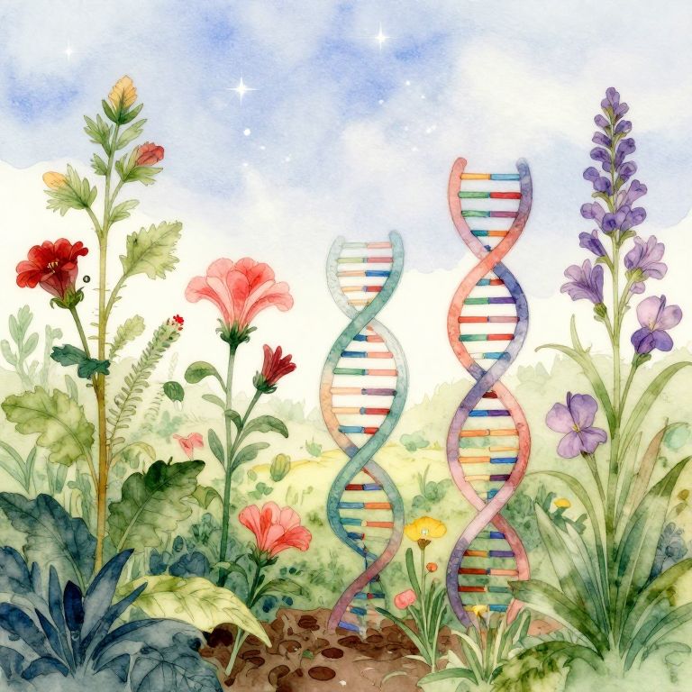 Artistic representation of plant breeding, blooming flowers merging with DNA helixes under a shimmering sky, soft watercolor textures combined with intricate line art, conveying growth and evolution in a peaceful garden setting.
