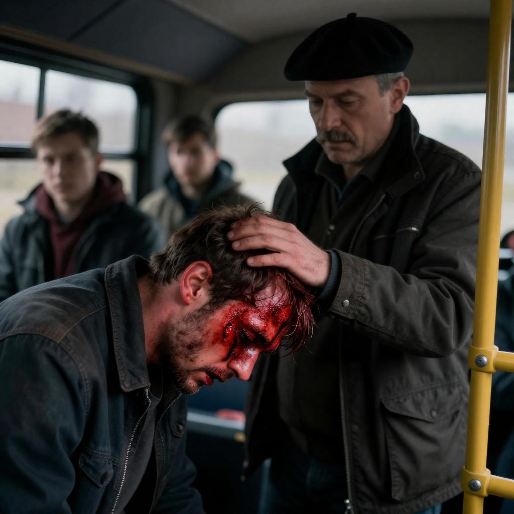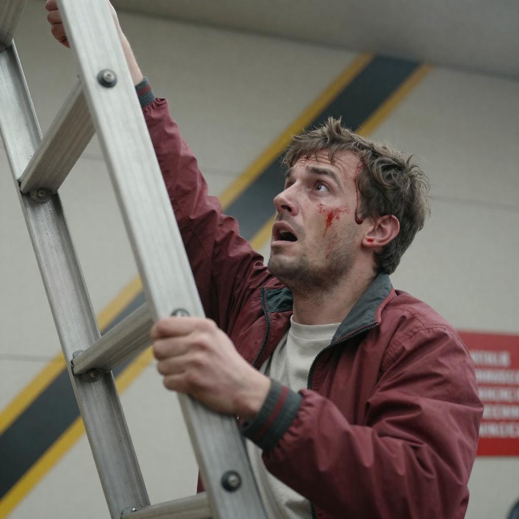 Photograph of a panicked man with blood on his face, wearing a red jacket, gripping a metal ladder. Another person's hand reaches down from above, partially obscured. Smoky background, yellow-black diagonal lines, and a red sign on the wall.