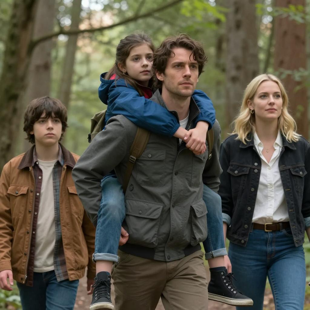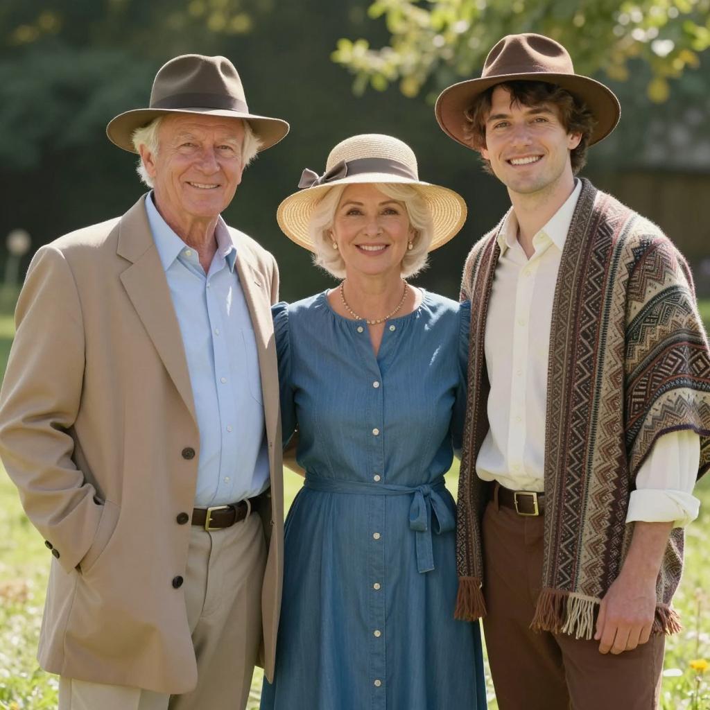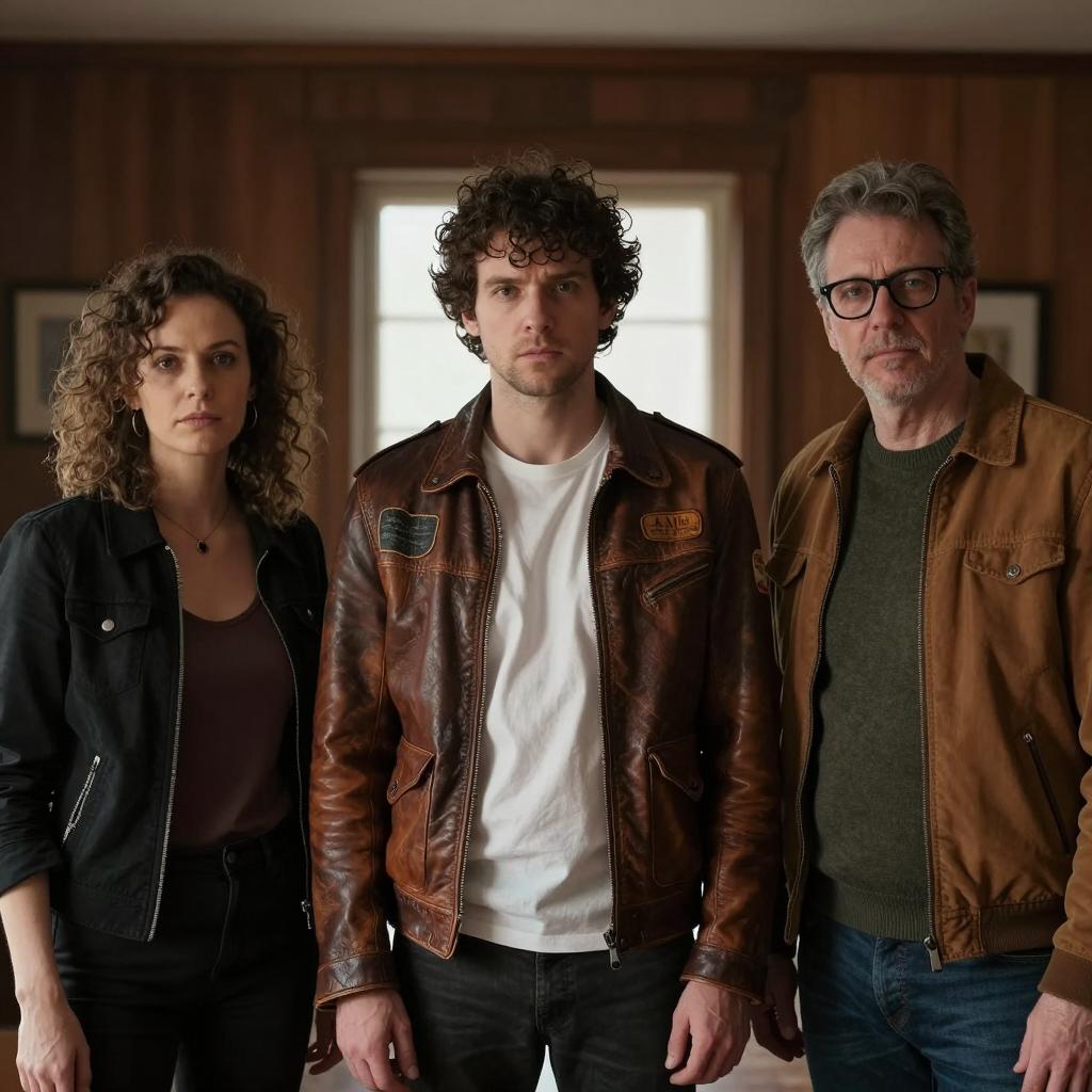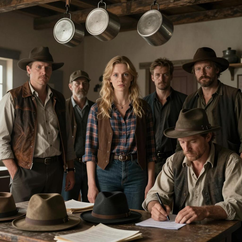 Five people in a rustic wooden cabin. An older man with gray hair, brown hat, and worn jacket sits left. A blonde woman in a checkered shirt stands center, talking to a dark-haired man in a green vest. Two men with dark hair, one in a red shirt, one in a plaid shirt, sit right. A colorful striped tablecloth covers the table. Shelves with jars and bottles fill the background. The dark-haired man in the green vest looks intently at the blonde woman.