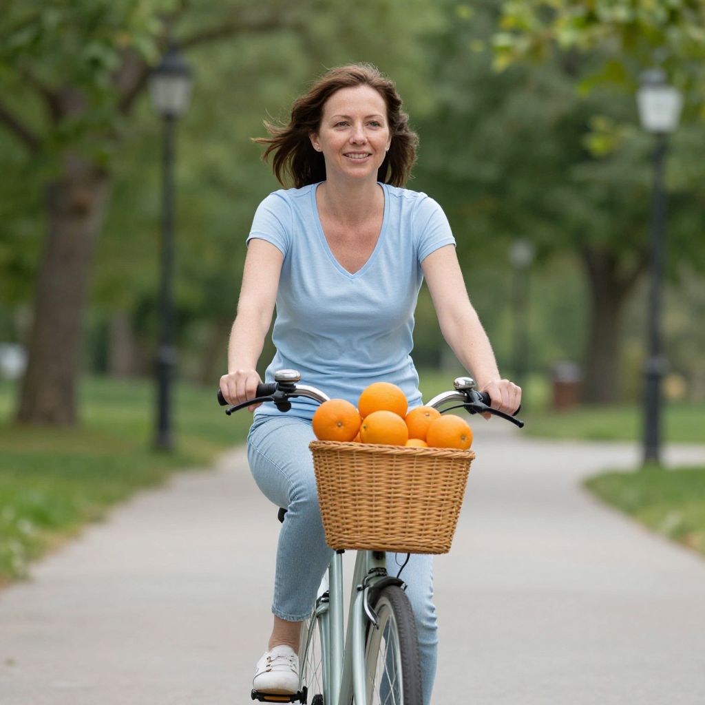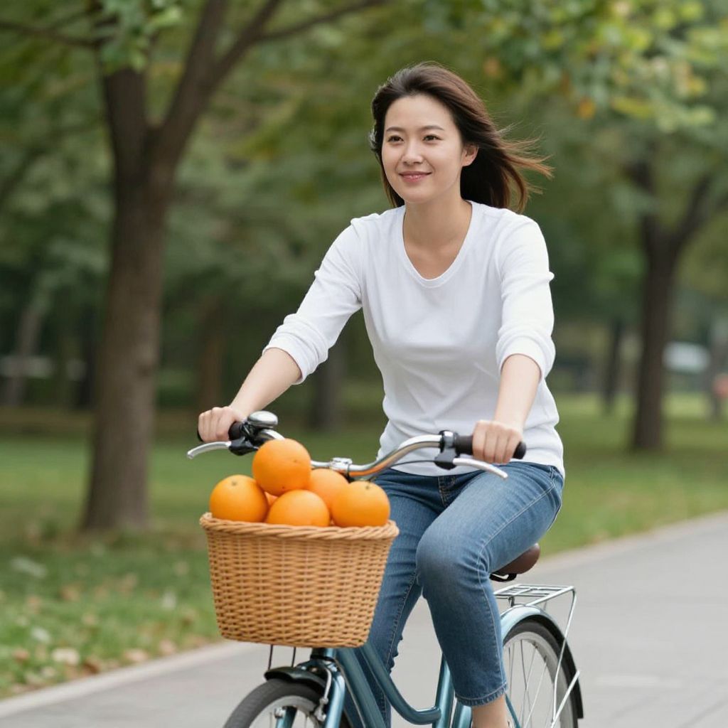 Smiling woman riding a bicycle with a wicker basket filled with vibrant oranges, set against a serene park backdrop with lush green trees and a paved pathway.