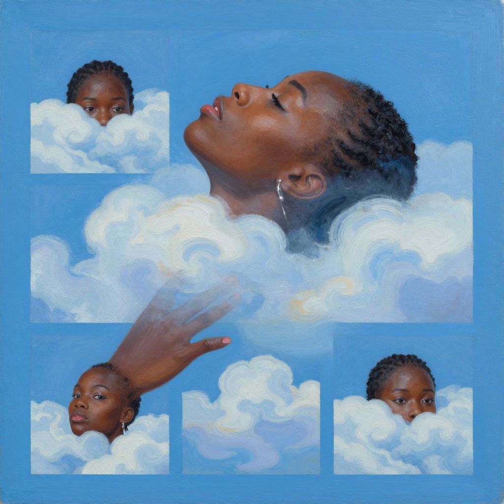 A vibrant digital painting features a dark-skinned woman with braided hair, eyes closed, and lips slightly parted, set against a bright blue background. She is partially enveloped in fluffy white clouds, with her head tilted back and one hand gracefully extended. The image includes four smaller inset portraits of the woman's head and shoulders, also surrounded by clouds, highlighting various expressions. Her earrings dangle subtly, and the overall style is realistic with a touch of surrealism, emphasizing a dreamy, ethereal quality. The textures of the clouds are soft and voluminous, contrasting with the smoothness of her skin.