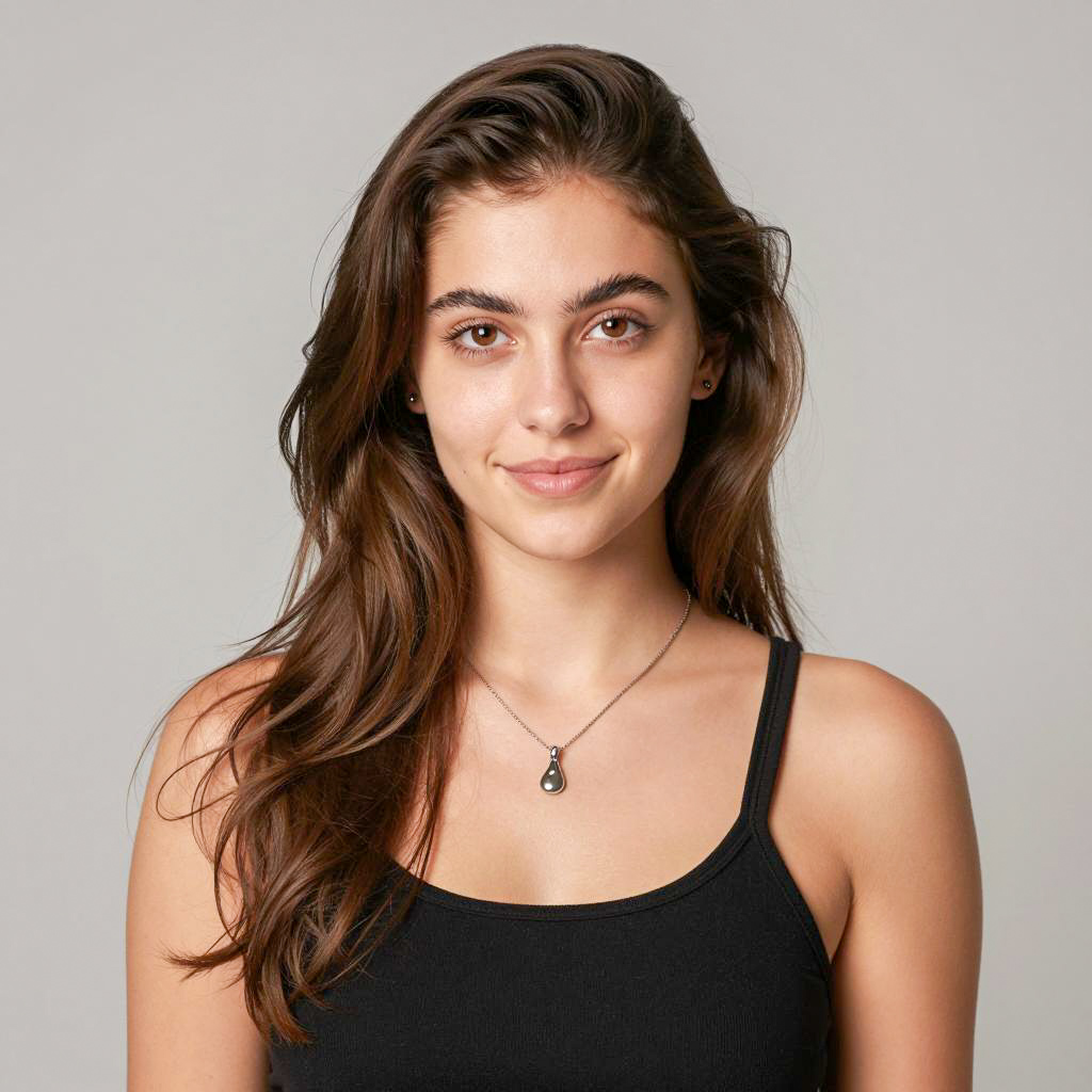 Photograph of a young woman with long, wavy brown hair, fair skin, and brown eyes. She wears a black tank top with thin straps, a silver necklace with a small pendant, and small ear piercings. Neutral background, centered composition. She has a slight, confident smile, and her hair falls loosely over her shoulders.