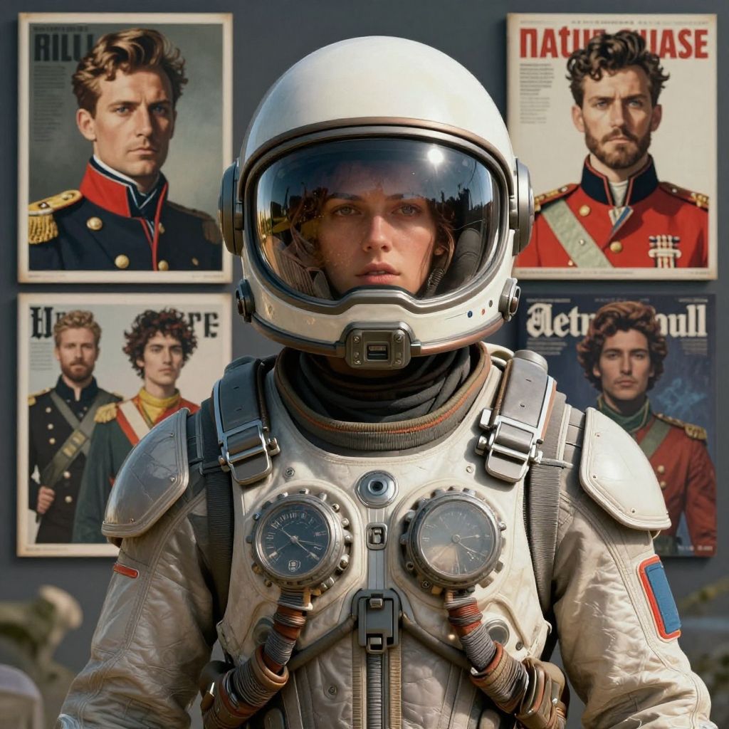 Photorealistic CGI of a serious man in a silver space suit with helmet, surrounded by historical military posters of bearded men.