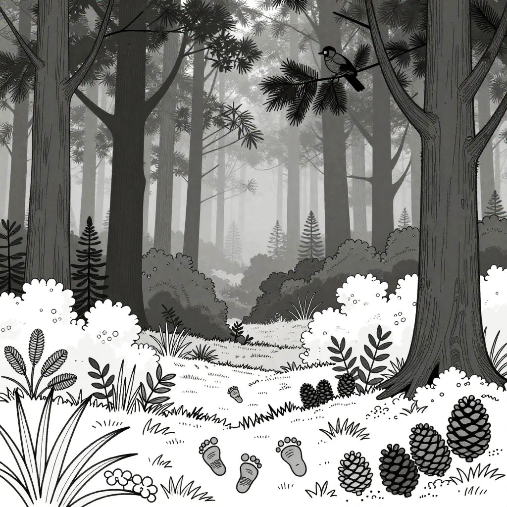 Realistic forest coloring pages capturing a misty forest morning scene with detailed silhouettes of tall trees, shrubs, and ground plants, including detailed drawings of animal footprints, pine cones, and birds perched on branches, ideal for nature lovers and artists.