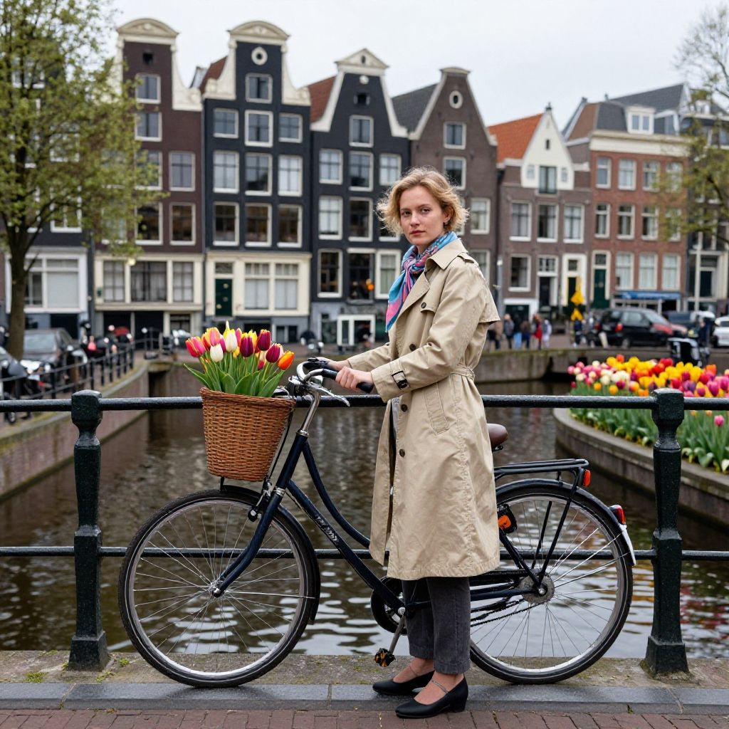 (style of Vivian Maier), [quintessential Dutch charm:Amsterdam's vibrant essence:0.7] cityscape, capturing the unique allure of Amsterdam through the day-to-day elegance of a local. Amidst this picturesque setting, a woman emerges as the embodiment of Amsterdam's soul, seamlessly blending the city's historic grace with its lively, contemporary rhythm. Her attire is a ((stylish yet comfortable ensemble)), perfect for cycling along the city's iconic canals. She dons a tailored, waterproof trench coat that whispers sophistication, paired with practical, chic footwear ideal for navigating the cobblestone streets. Her outfit is complemented by a casual scarf, adding a pop of color, and a classic, sturdy bicycle at her side, equipped with a quaint basket filled with fresh tulips. The backdrop features the charming canal houses of Amsterdam, their gabled facades a testament to the city's rich architectural history, standing tall and elegant along the serene waterways. The scene transitions smoothly into the vibrant tulip fields just outside the city, a sea of colors that captures the essence of Dutch beauty in spring. The composition skillfully intertwines Amsterdam's famed cycling culture, as the woman pauses on a bridge over a canal, her bicycle leaning gently against the railing. She takes in the view, a blend of tradition and modernity, her figure a connecting thread between the city's past and its dynamic present. This moment encapsulates the spirit of Amsterdam, where every turn reveals a new facet of its diverse character, from the tranquility of its waterways to the bloom of its countryside, all seen through the eyes of one who calls it home. (stunning intimate moody cinematic establishing shot, young adult woman looking at viewer, highly detailed background:1.1), volumetric lighting, subsurface scattering, dynamic pose, (special effects, color grading, fantasy aura:1.4)