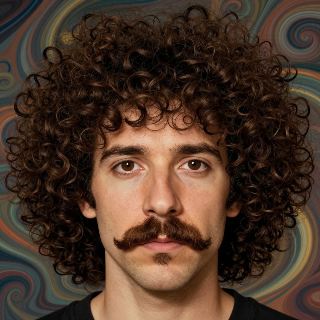 Curly hair with mustache, artistic illustration of a man with voluminous curly hair and a distinct mustache, surreal background with swirling abstract elements, rich contrasting colors, high detail on hair curls and mustache texture, expressive eyes