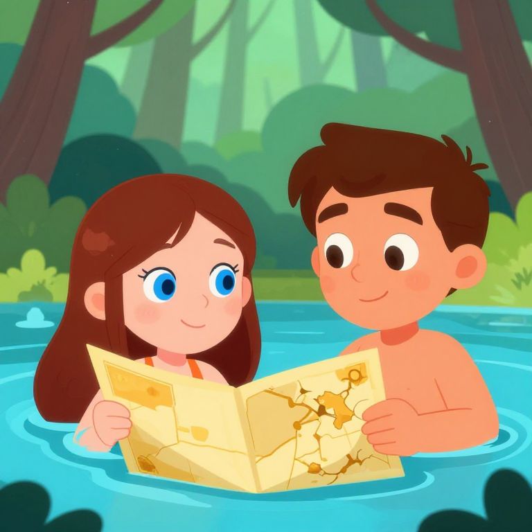This is a colorful digital cartoon illustration depicting a young boy and girl with large, expressive blue and brown eyes, respectively, standing in a bright blue, shallow pond. The girl has long brown hair and is holding a yellow map with a star symbol, while the boy, with short brown hair, looks at the map. Both are shirtless, revealing light skin. The background features a dense, green forest with tall trees and bushes. The pond's water ripples gently around them, adding a sense of movement. The overall style is whimsical and child-friendly, with smooth lines and vibrant colors.