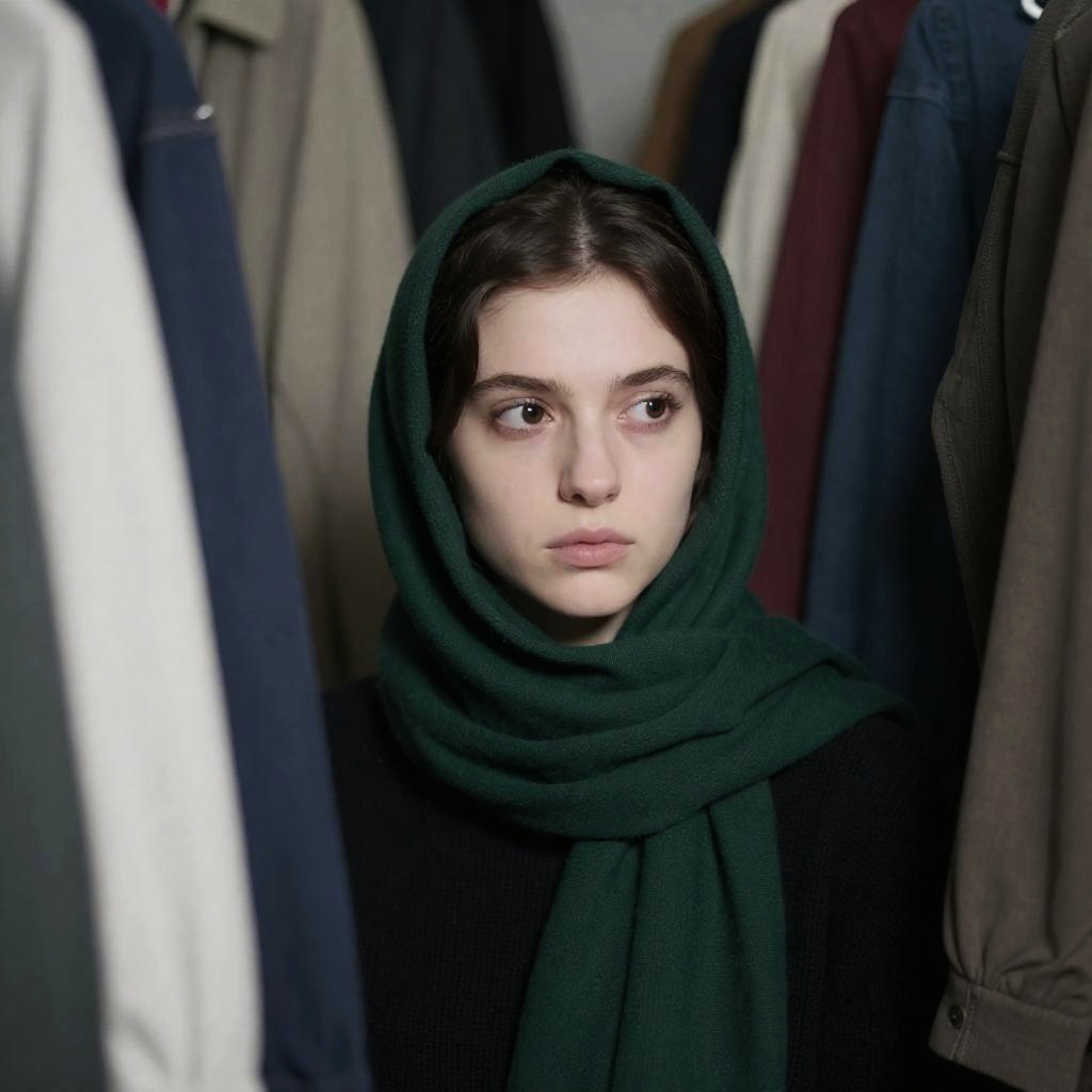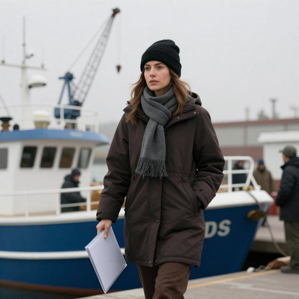 Blonde woman with messy hair, wearing a gray wool coat and red knitted scarf, stands alone on an empty industrial lot. Background includes green cargo cranes, yellow machinery, and distant buildings. She looks to the side, hands clasped. Overcast sky.