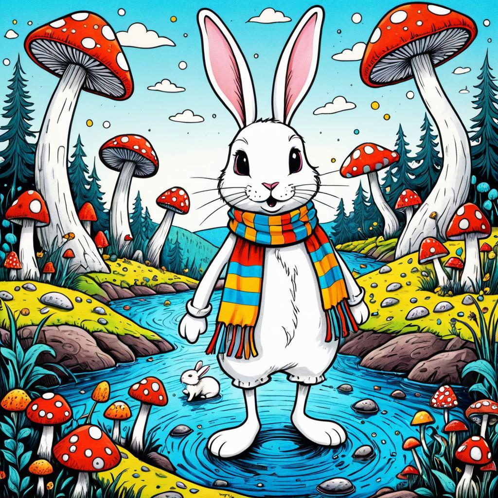 A funny, square, anthropomorphic green frog with thin legs, wearing a quirky suit, in the style of Tim Burton, surrounded by fantasy mushrooms. Drawing in the style of a very bright, colorful anti-stress coloring book, high quality, with a snowy background.