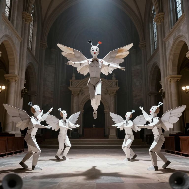 A troupe of paper-winged mimes performs a gravity-defying pantomime in a hollow church now filled entirely with silent thunder.