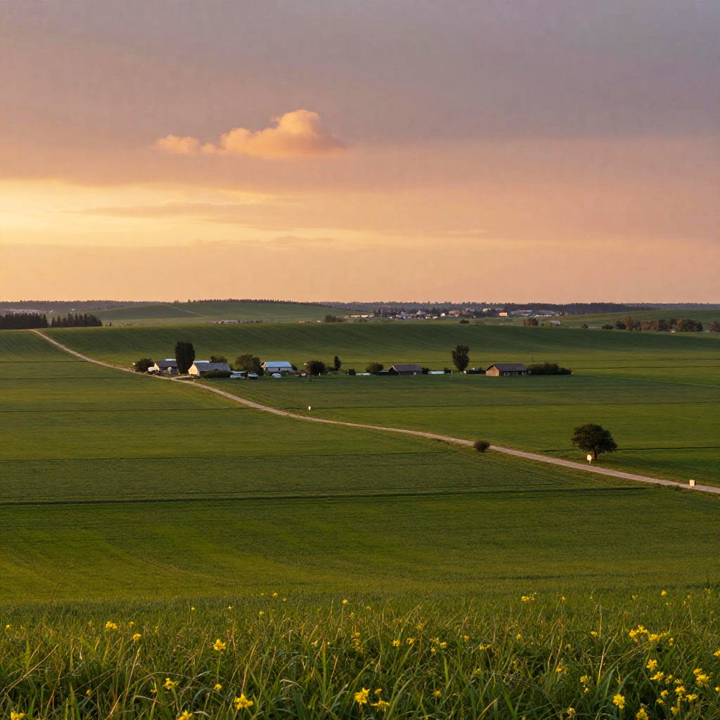 Photograph of a rural landscape at sunset, featuring green fields, a dirt road, small houses, and a cloud-filled sky with pink and purple hues