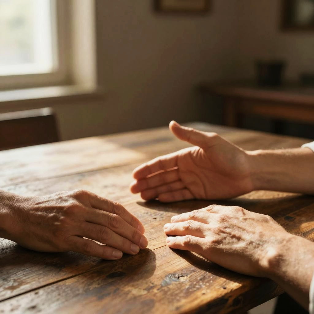 Reconciliation portrayed as two hands reaching out across a weathered wooden table, soft golden sunlight filtering through nearby windows, capturing a moment of peace and understanding, warm earthy tones, realistic yet softly stylized, gentle expression of healing and forgiveness.