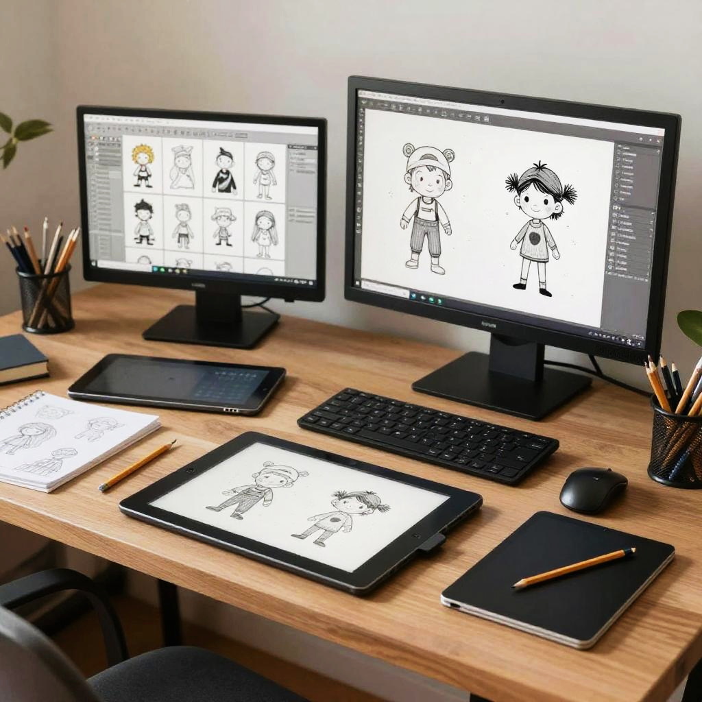 Drawing character generator scene with an artist's desk full of digital tablets, traditional pencils, and imaginative character designs emerging from screens, soft natural lighting, cozy creative studio, detailed hand-drawn and digital mixed media effect