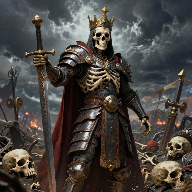 Digital art of a skeletal king in dark armor and crown, wielding a sword, surrounded by skulls and swords under a stormy sky.