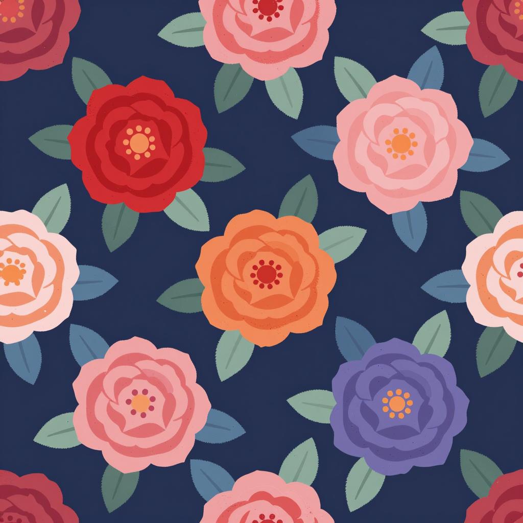 Seamless floral pattern featuring vibrant roses in shades of red, pink, orange, and purple against a dark blue background with green and blue leaves. Stylized vector art suitable for textiles, wallpapers, and decorative design.