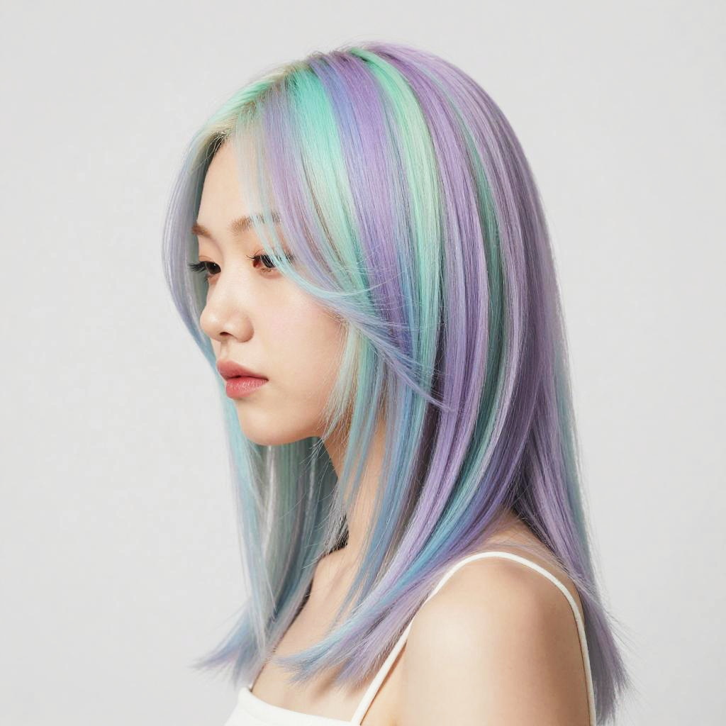 Change hair color in picture to pastel rainbow tones including lavender, mint green, and baby blue, blending seamlessly with smooth texture, enhanced by soft diffused lighting in a minimalist modern studio backdrop, highlighting creative and playful mood.