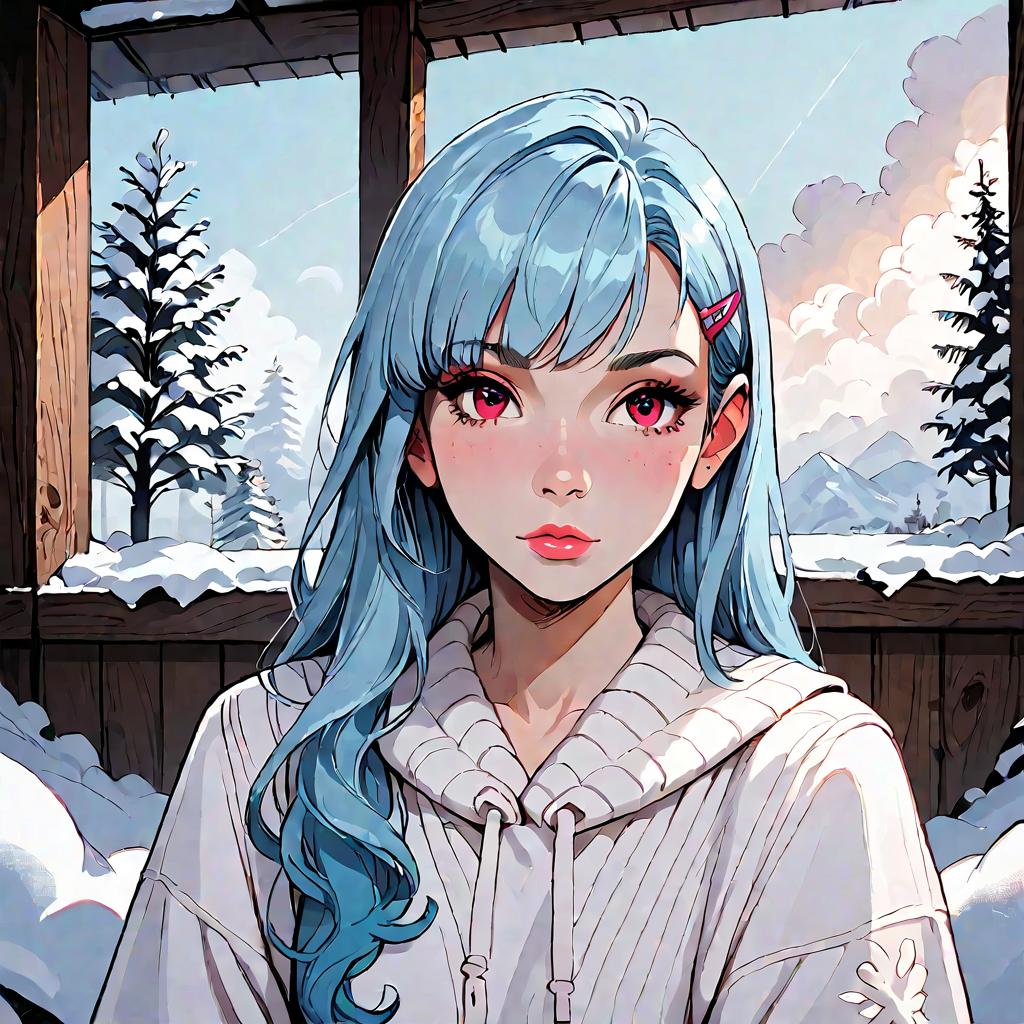 Score_9, score_8_up, score_7_up, score_6_up, score_5_up, score_4_up, source_anime, 1girl, animeirl, pale blue hair, long hair, hair clips, brown eyes, indoors, snow, depressed, dark clouds