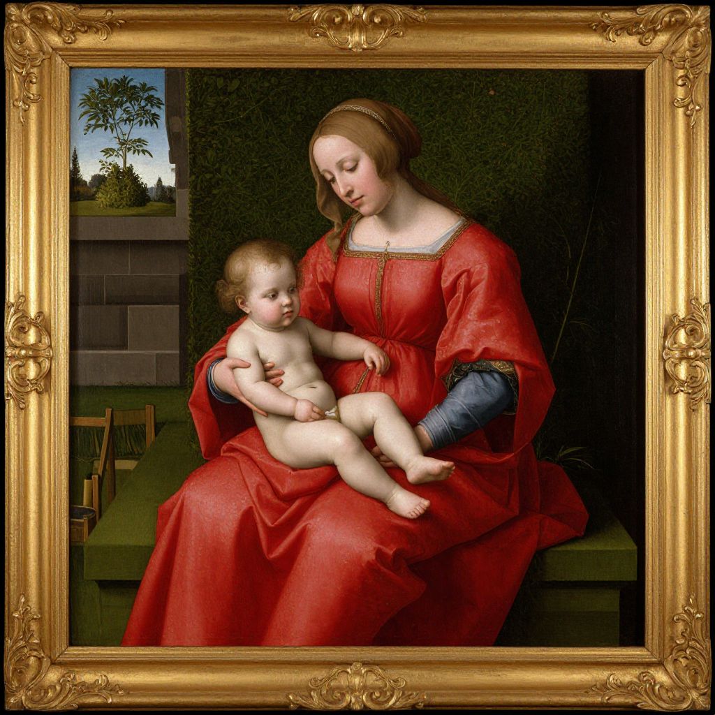 Richly detailed Renaissance painting by Dieric Bouts the Elder, titled *St. Luke Drawing the Virgin and Child*, depicts a serene scene from c. 1440-1475, featuring a woman in vibrant red attire seated outdoors, cradling a nude infant on her lap, surrounded by lush greenery and architectural elements, encased in an ornate gold frame.