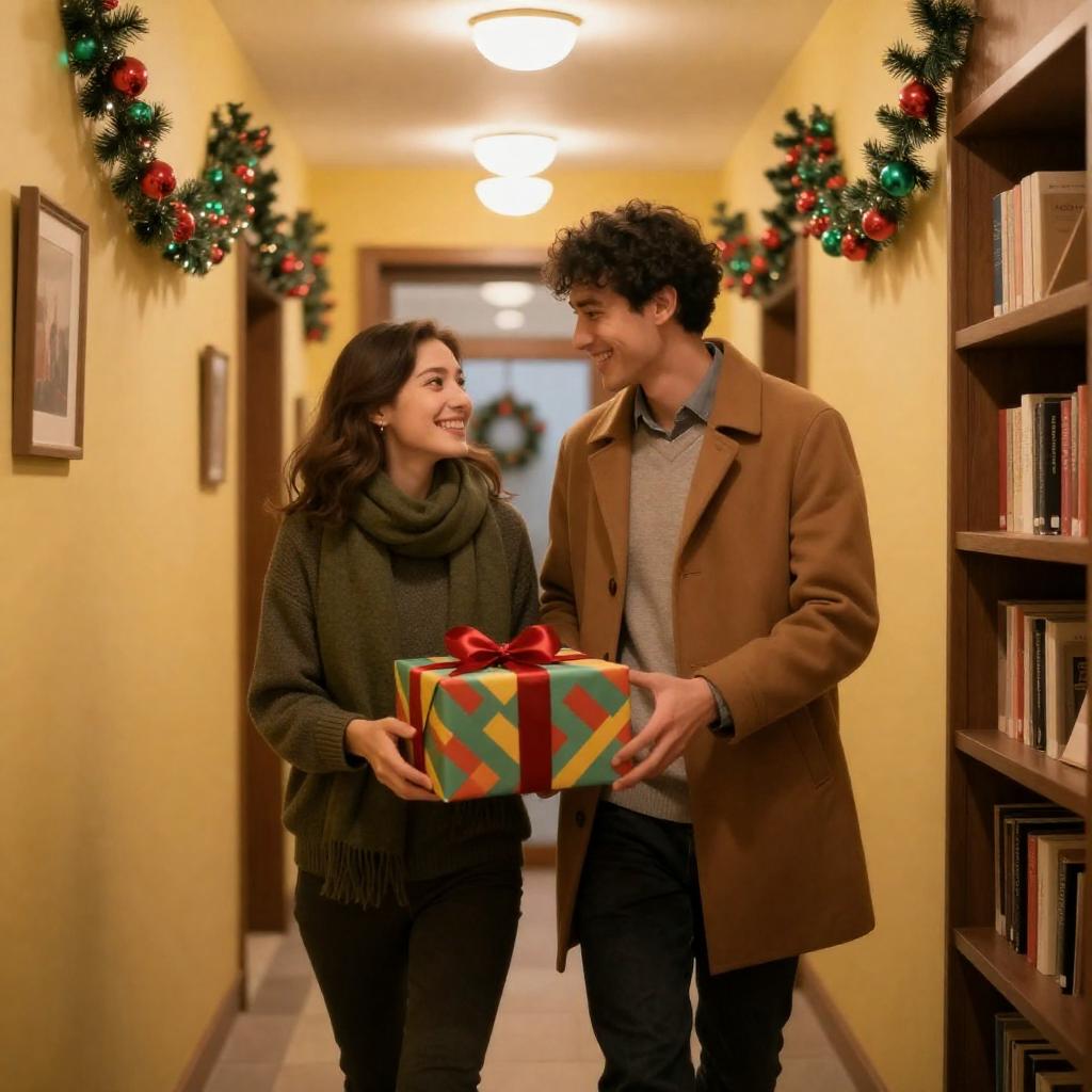 Young couple walking through a warmly lit hallway decorated with Christmas garlands and wreaths. The man, with dark curly hair, wearing a brown coat and grey sweater, holds a colorful wrapped gift box with a red ribbon. The woman, with long brown hair and a green scarf, smiles warmly at him. Yellow walls, a bookshelf, and festive décor create a cozy holiday atmosphere.