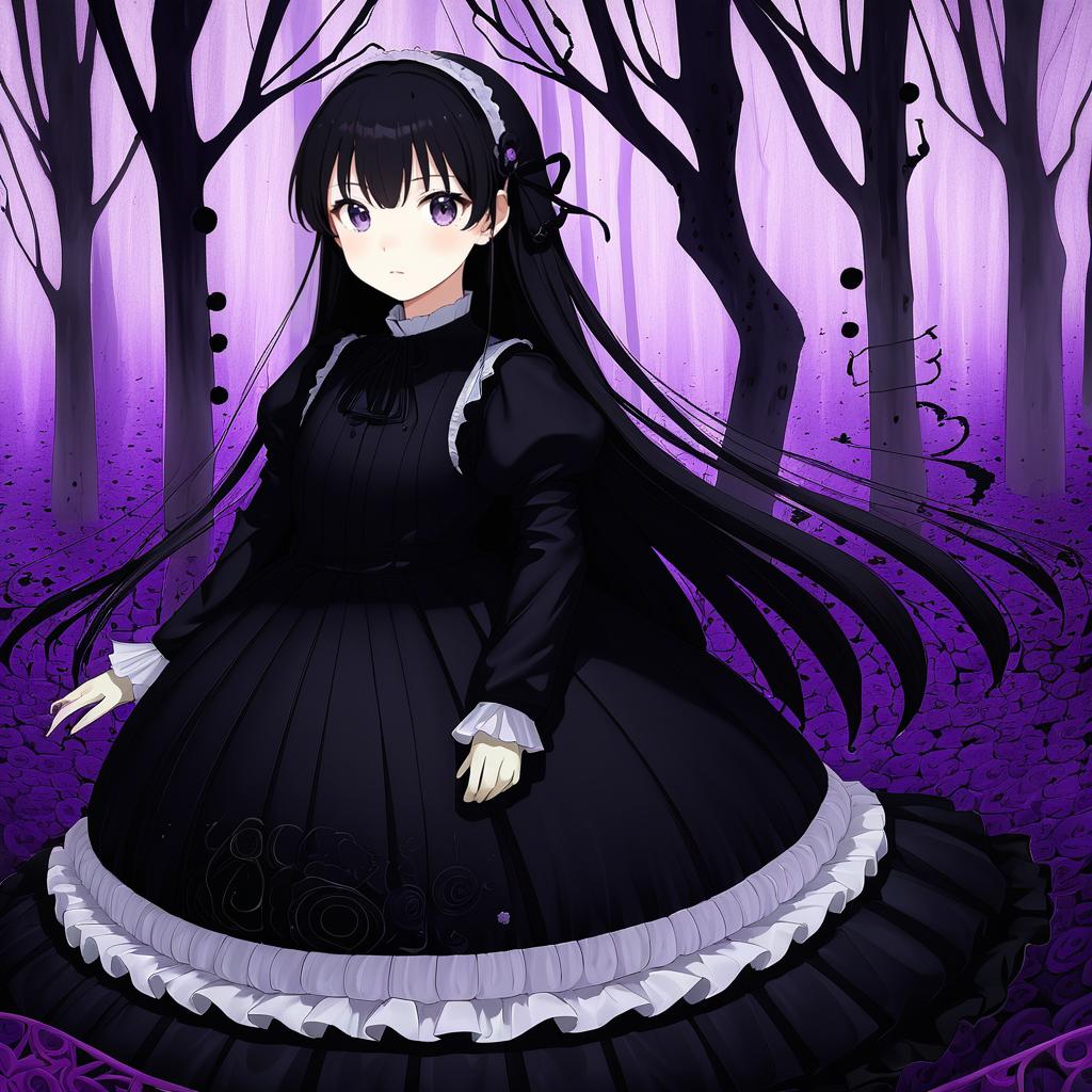 Anime style illustration of a young girl with long black hair and purple eyes wearing a black funeral dress with white lace trim and a matching hairband. She stands in a dark, eerie forest with leafless black trees and a purple misty background, creating a mystical and somber atmosphere.