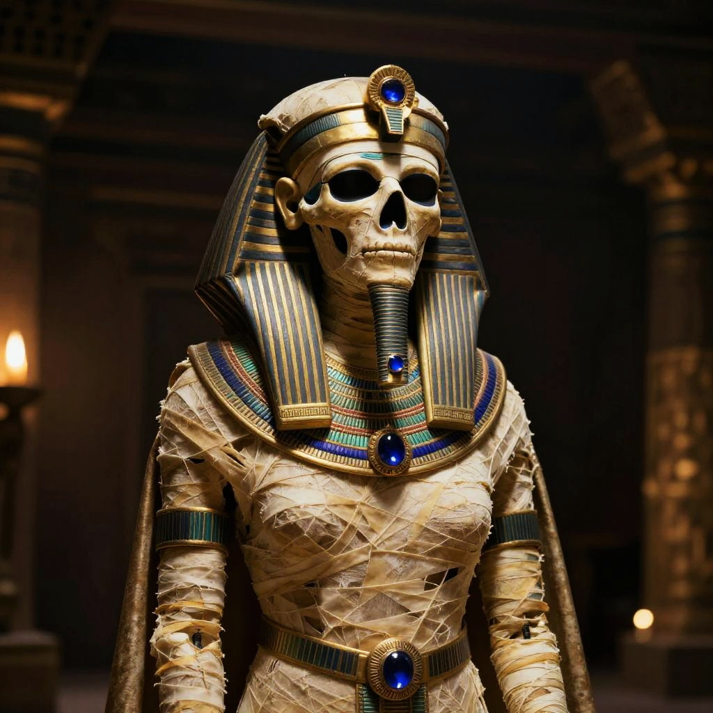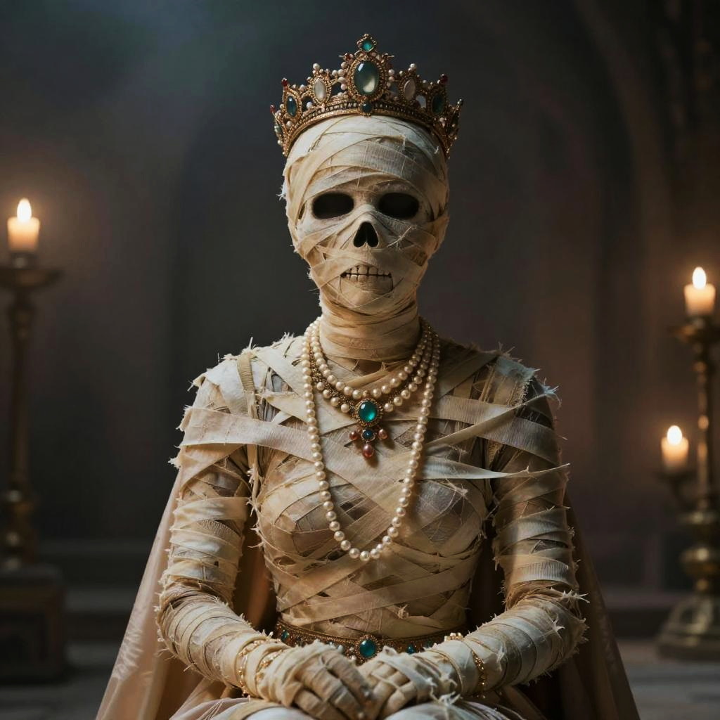 Realistic photo.The image features an ancient queen in full attributes, depicted as a mummy. She is wearing a golden diadem and a sapphire necklace, with a golden diadem on her head and a sapphire necklace around her neck. The mummy's face is skeletal, and she appears to be wearing a luxurious gown. The scene is set in a dimly lit environment, with a dark background and a few lights illuminating the mummy. The overall atmosphere of the image is eerie and mysterious, as it captures the essence of a long-deceased queen preserved in her tomb. realistic photo