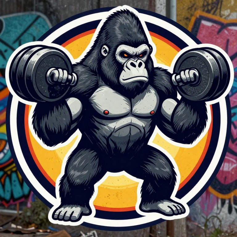 Cartoon-style image of a muscular, black-and-white gorilla lifting dumbbells, standing in front of a vibrant orange and yellow circular background,