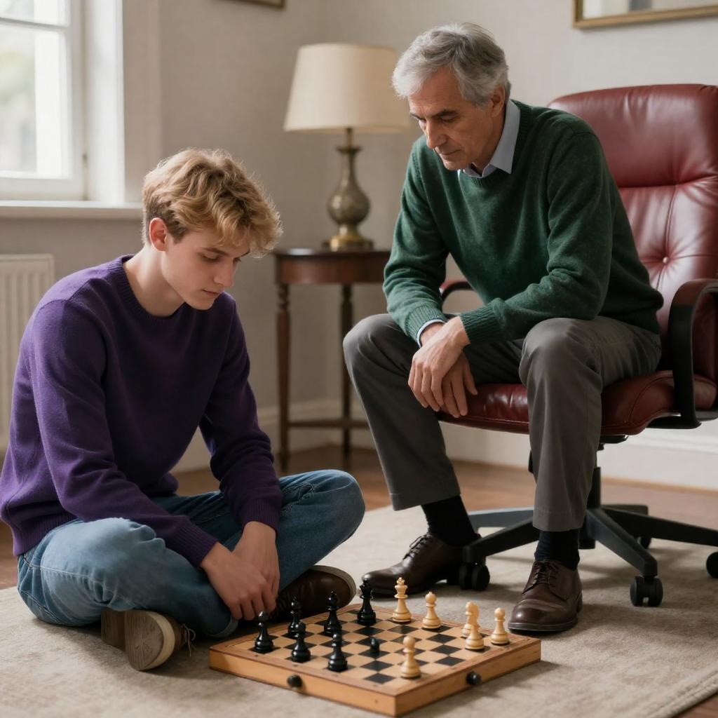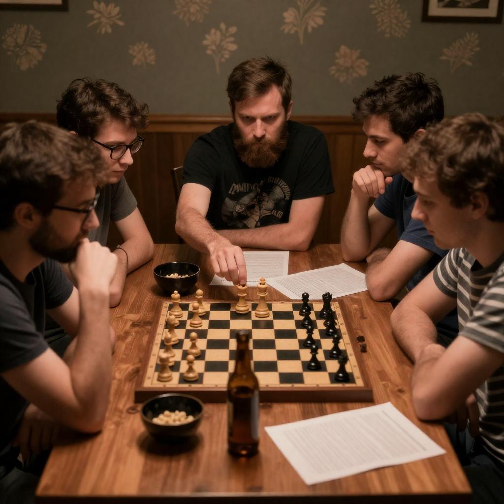 Five young men gathered around a wooden table engaged in a game of chess. The man in the center, with a beard and black graphic t-shirt, makes a move while others watch intently. The setting is a dimly lit room with floral wallpaper, snacks in black bowls, a beer bottle, and papers scattered on the table. Casual indoor atmosphere with focused expressions.