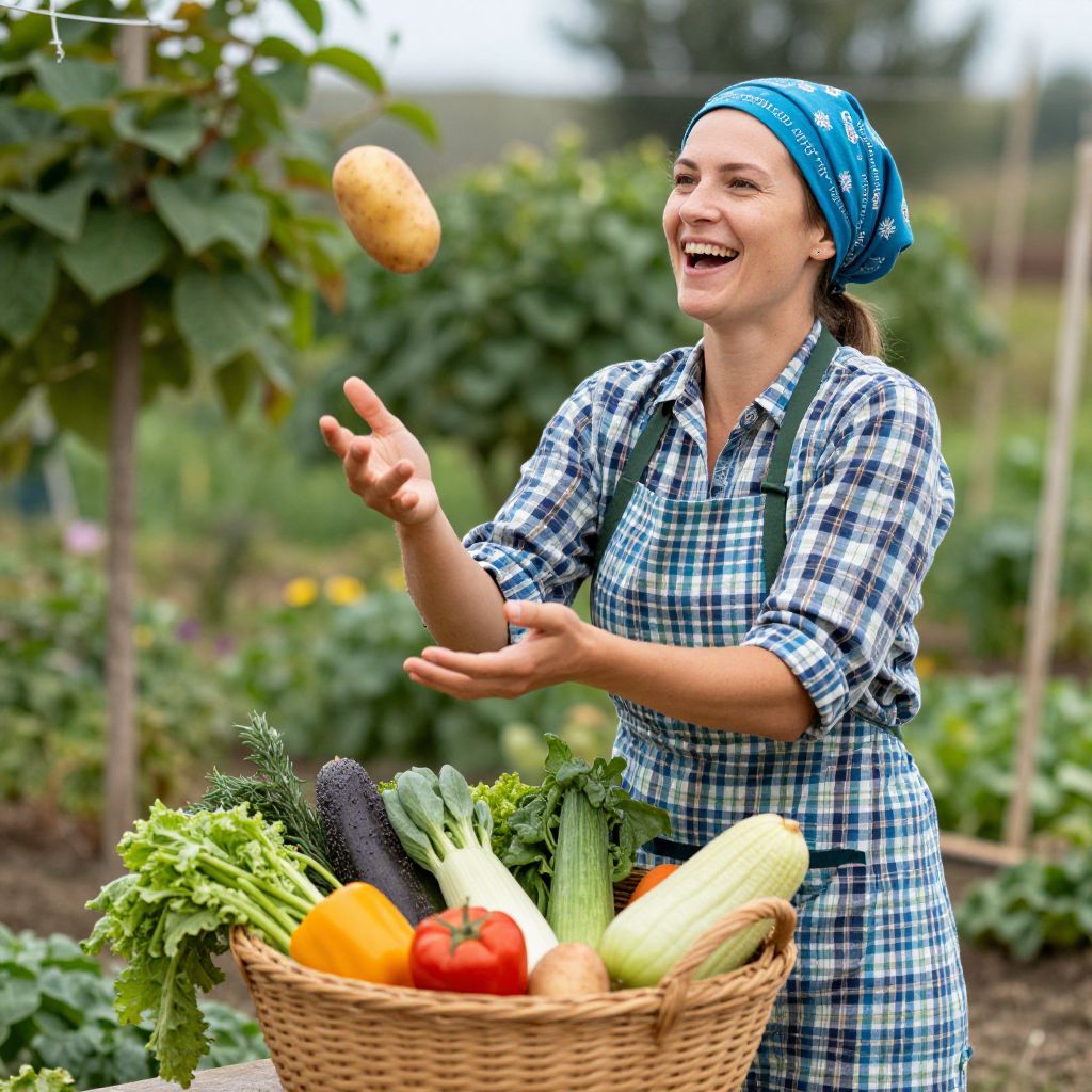 Joyful laughter fills the air as a woman, adorned in a vibrant blue head wrap and plaid apron, tosses a golden potato into a woven basket brimming with freshly harvested produce in a lush, verdant garden.