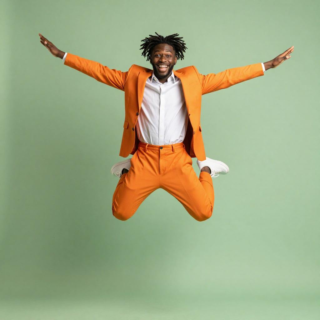 Photograph of a joyful Black man with medium-dark skin and shoulder-length dreadlocks, wearing a bright orange suit with a white dress shirt, and white sneakers. He's mid-jump with arms spread wide and a big smile on his face. The background is a solid, light green color, making his orange suit stand out prominently. The image has a lively, energetic vibe.