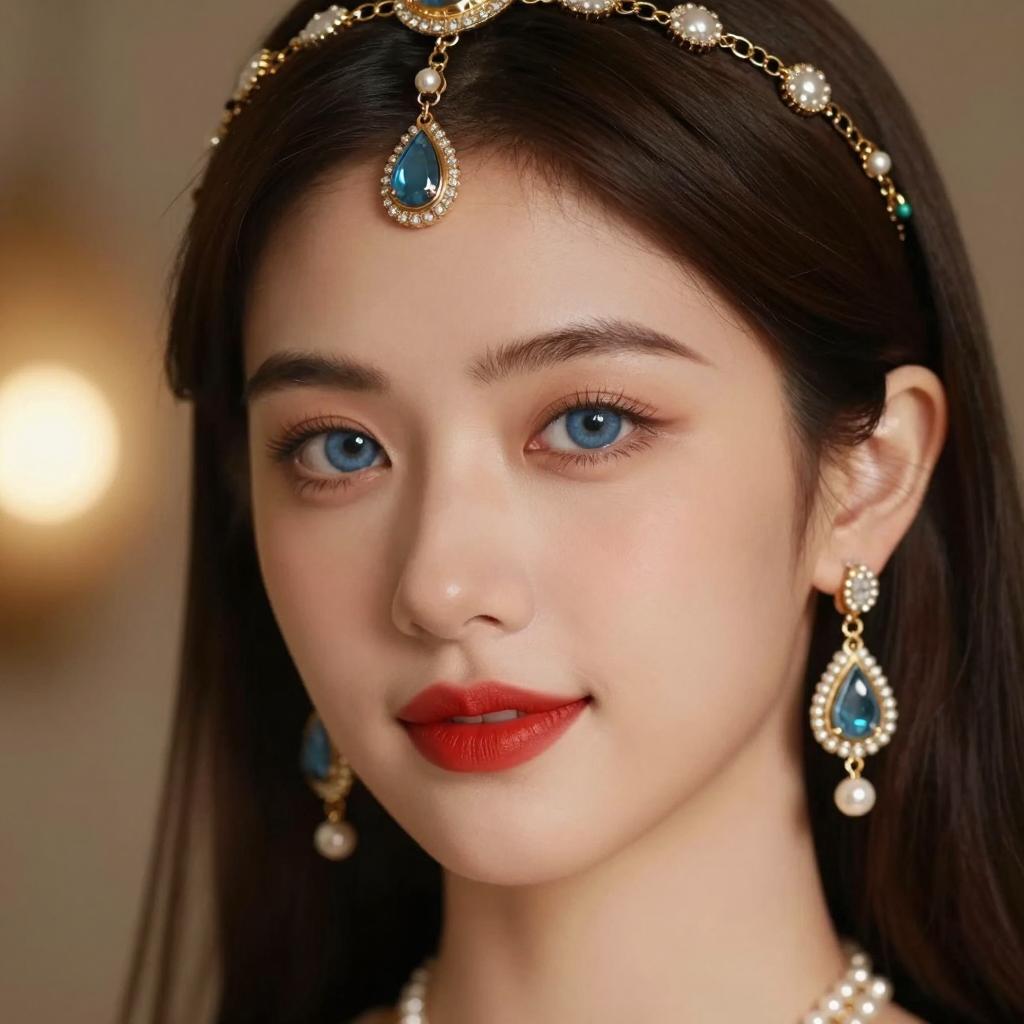 Close-up photograph of a pale-skinned woman with red hair, blue eyeshadow, and red lipstick. She wears a long, dangling blue and silver earring. Her eyes are closed, and her head is tilted to the right. The lighting is blue-toned.