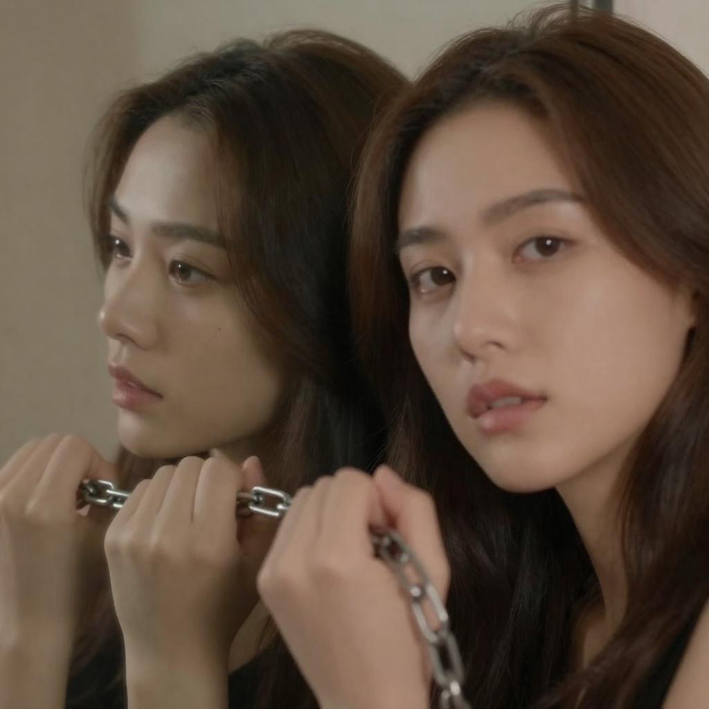 Close-up portrait of two young women facing each other with intense gazes. The woman on the left has light brown hair, fair skin, and wears a dark sleeveless top. The woman on the right has blue-gray hair, light skin, and wears a sleeveless gray shirt. The woman on the right gently holds the chin of the woman on the left. The background is softly blurred.