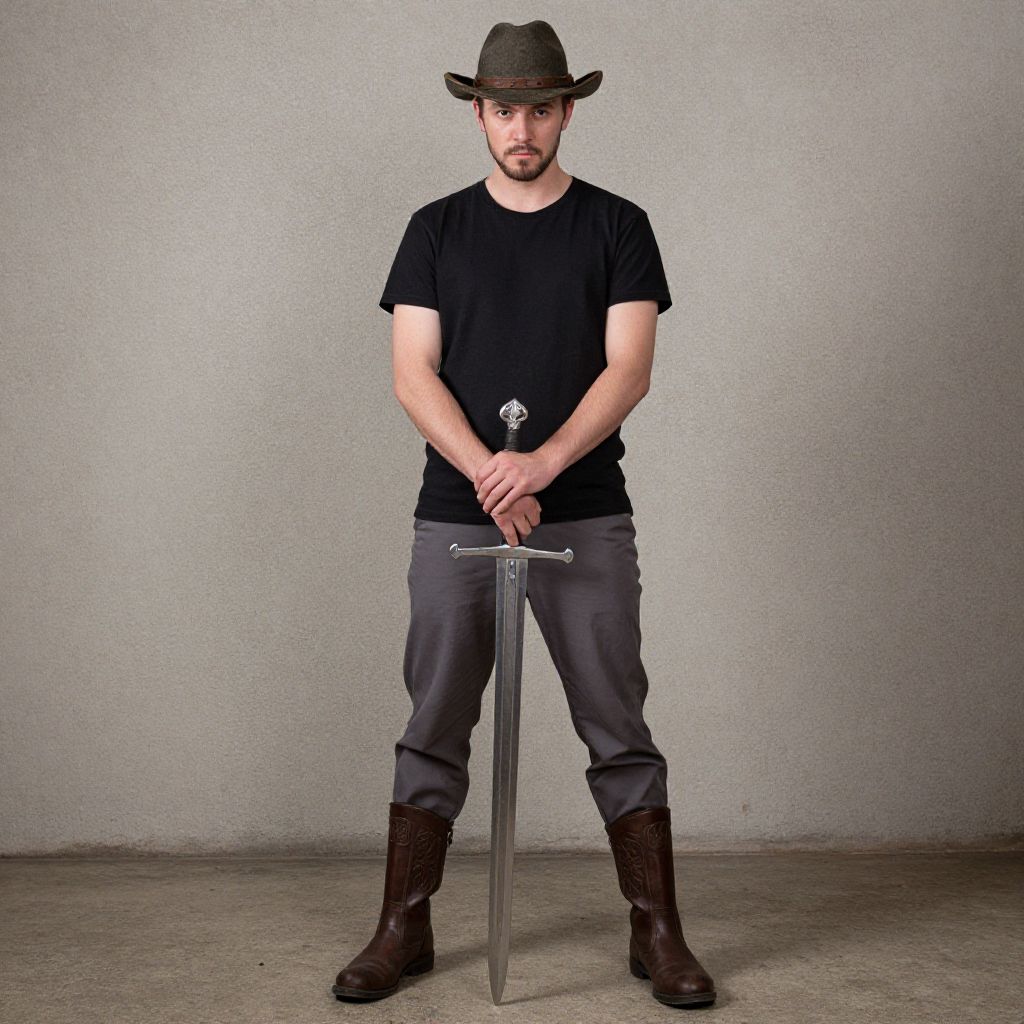 Photograph of a bearded man in black shirt, gray pants, brown boots, and cowboy hat, holding a sword upright, standing against a textured
