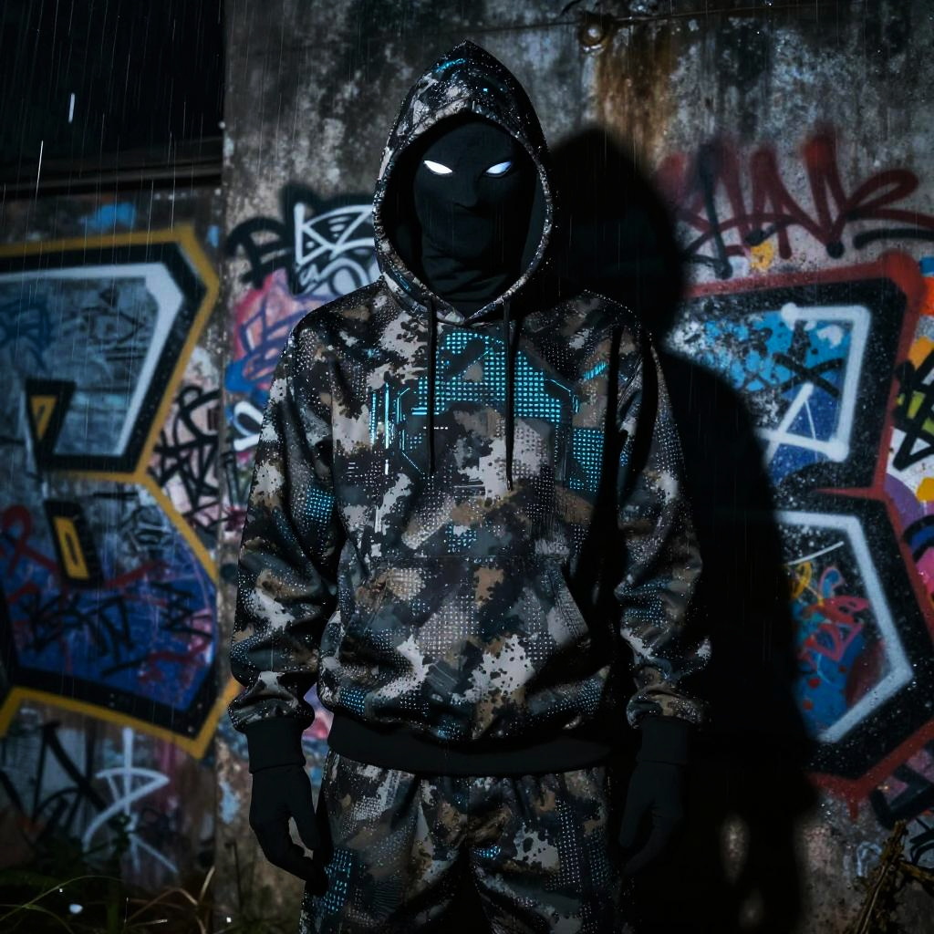 Sigma creeper in an urban dystopian landscape, shadowed figure blending into graffiti walls, sharp angular features, digital camouflage pattern, dramatic night scene with rain effects