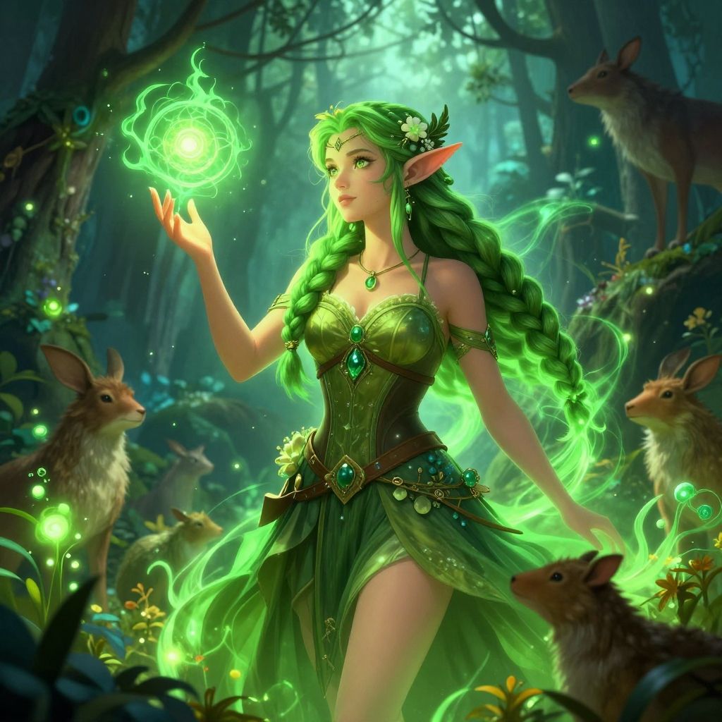 Female wood elf DnD druid casting nature magic, surrounded by forest animals and glowing plants, intricate braided hair with flowers, ethereal green aura, vibrant fantasy illustration