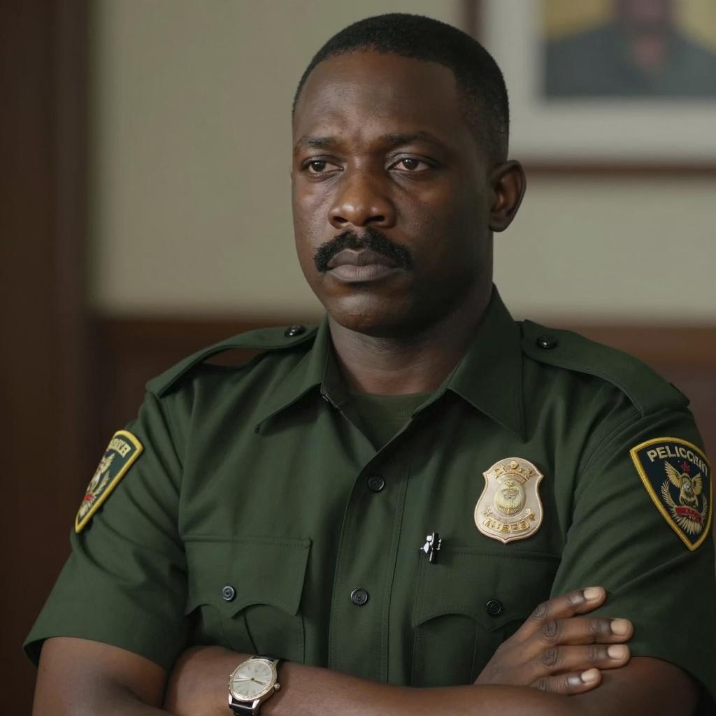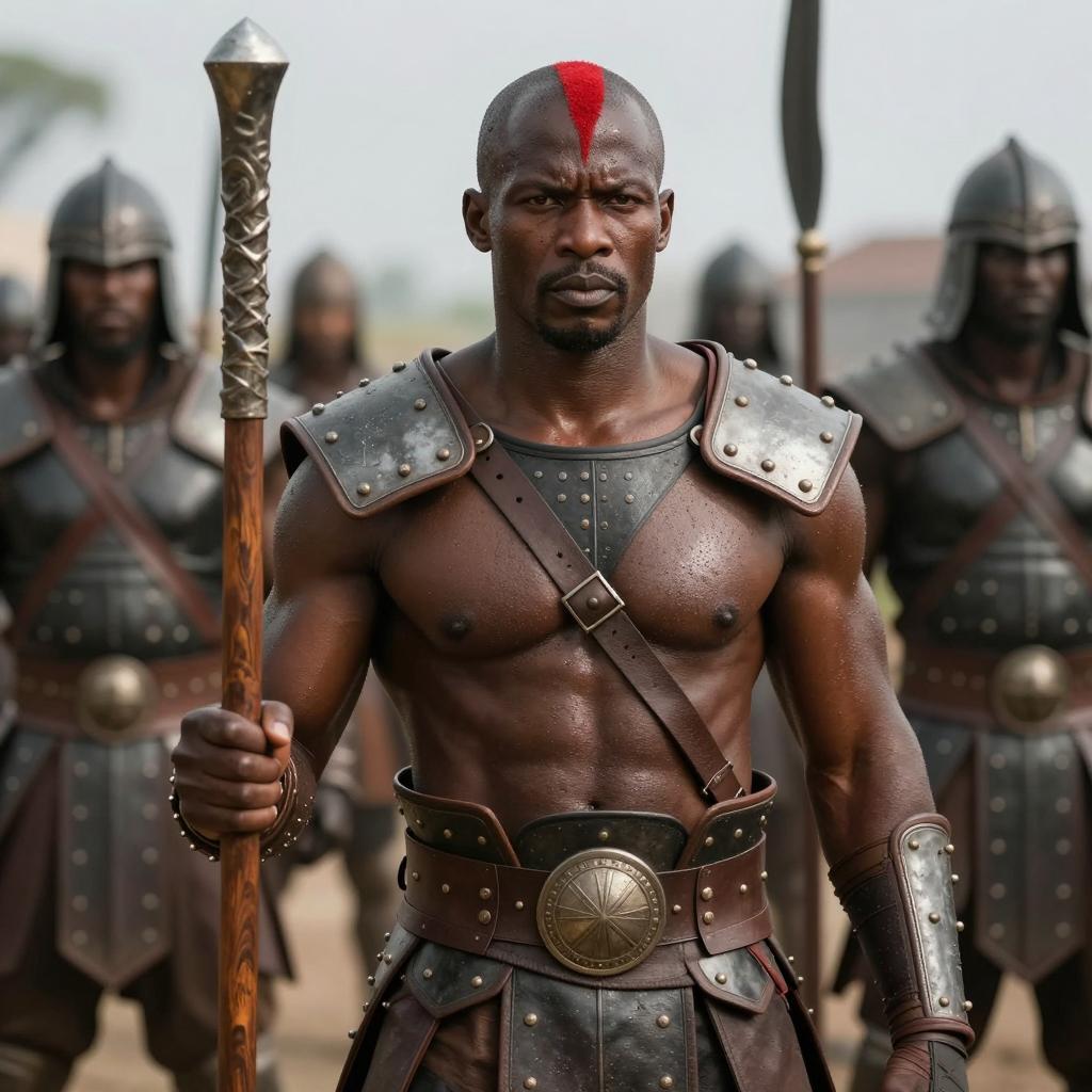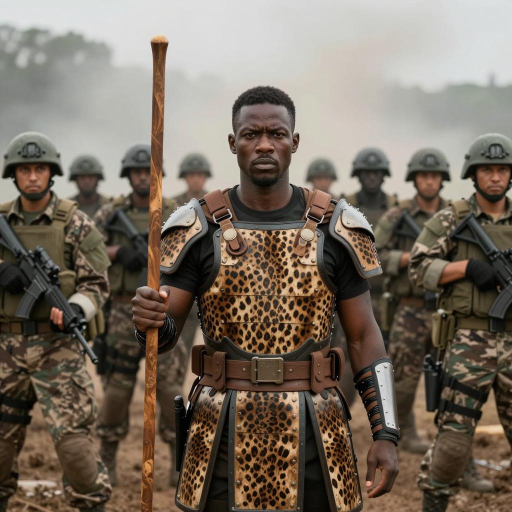 Photograph of five African American men in a military setting. Central man is shirtless, muscular, wearing green shorts and dog tags. Two men on left and right wear beige military uniforms and hats. Man on right points at central man, wearing an MP hat. Background has dim lighting and blurred figures. All men have serious expressions.