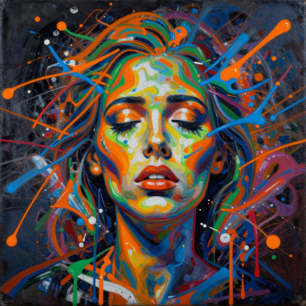 The image depicts a striking oil painting on acid, with vivid and intense colors splattered across the canvas. The face of a woman is the focal point, her features outlined by a chaotic array of paint strokes in shades of orange, green, and blue. The paint appears to be dripping and pooling, creating a sense of movement and fluidity. The woman's eyes are closed, adding a sense of emotion and introspection to the scene. The background is dark, which contrasts sharply with the bright, vibrant colors of the paint, making them stand out even more. The overall composition is dynamic, with the paint splatters and drips creating a sense of chaos and energy. The interplay of colors and textures adds depth and complexity to the image, making it a captivating visual experience.