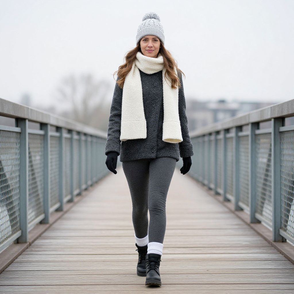 Winter Leggings Costume, woman in a hat and scarf walking on a bridge