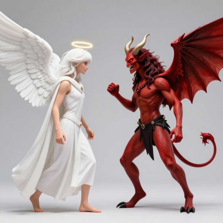 A white-winged angel and a red-winged demon stand apart from each other in a conflict for supremacy, with the angel wearing a halo and a white cloak, and the demon having two horns, a tail, and black wings.