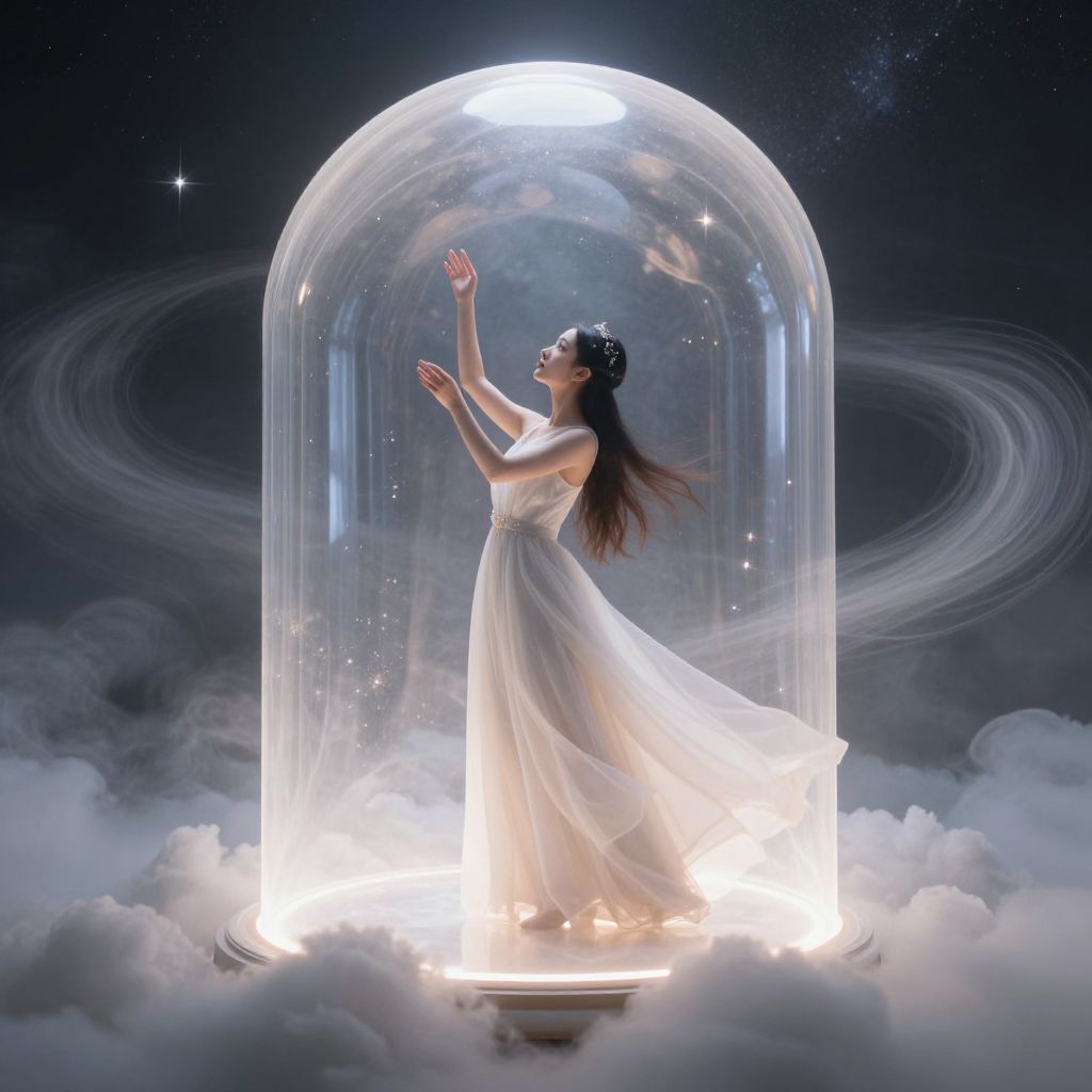 Ethereal clouds swirl gracefully around a woman in a flowing gown as she stands inside a luminous, transparent dome, her hands reaching upward amidst a backdrop of swirling mist and starry reflections.