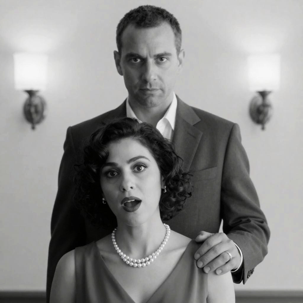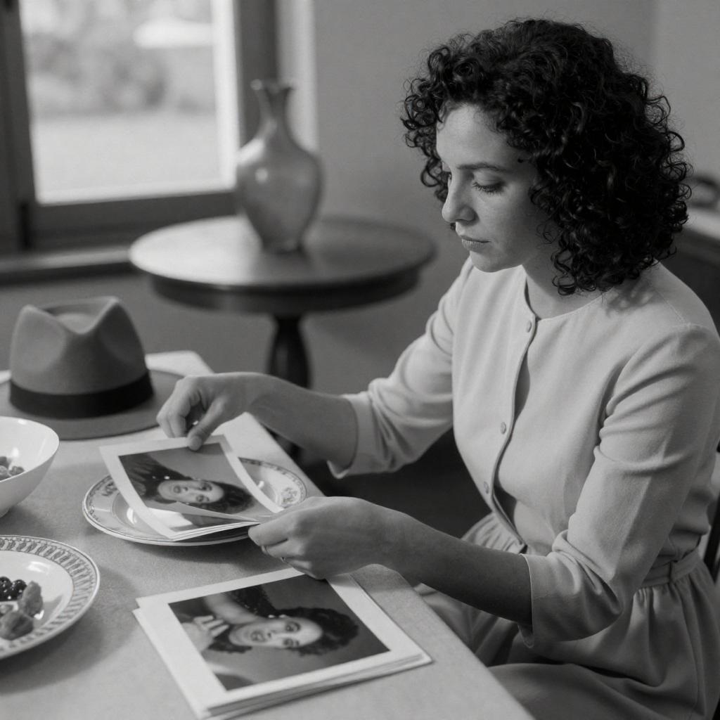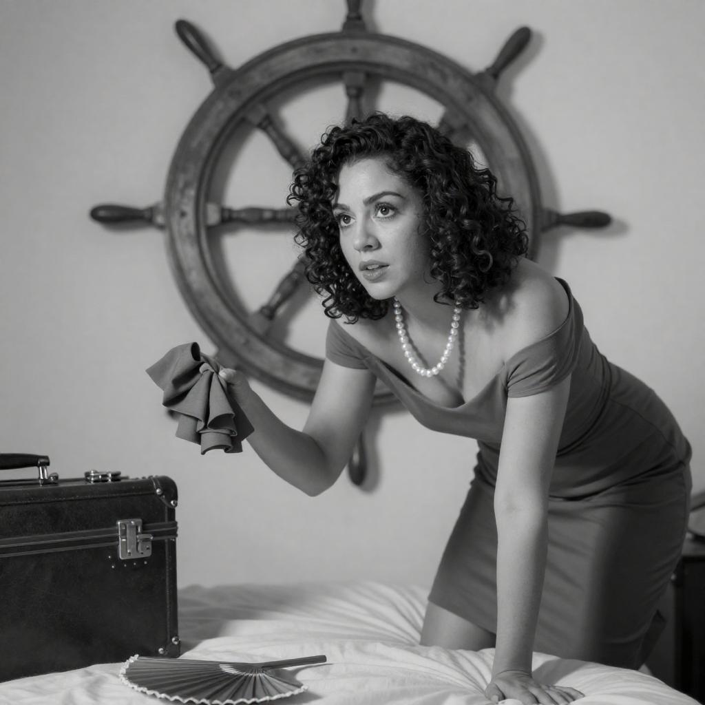 Black-and-white photograph of a woman with curly hair, wearing an off-the-shoulder dress and pearl necklace, leaning forward over a bed. A sailor's nautical wheel is on the wall behind her. She holds a crumpled fabric in her right hand. A suitcase and a hand fan are on the bed. Her expression is intense and focused.